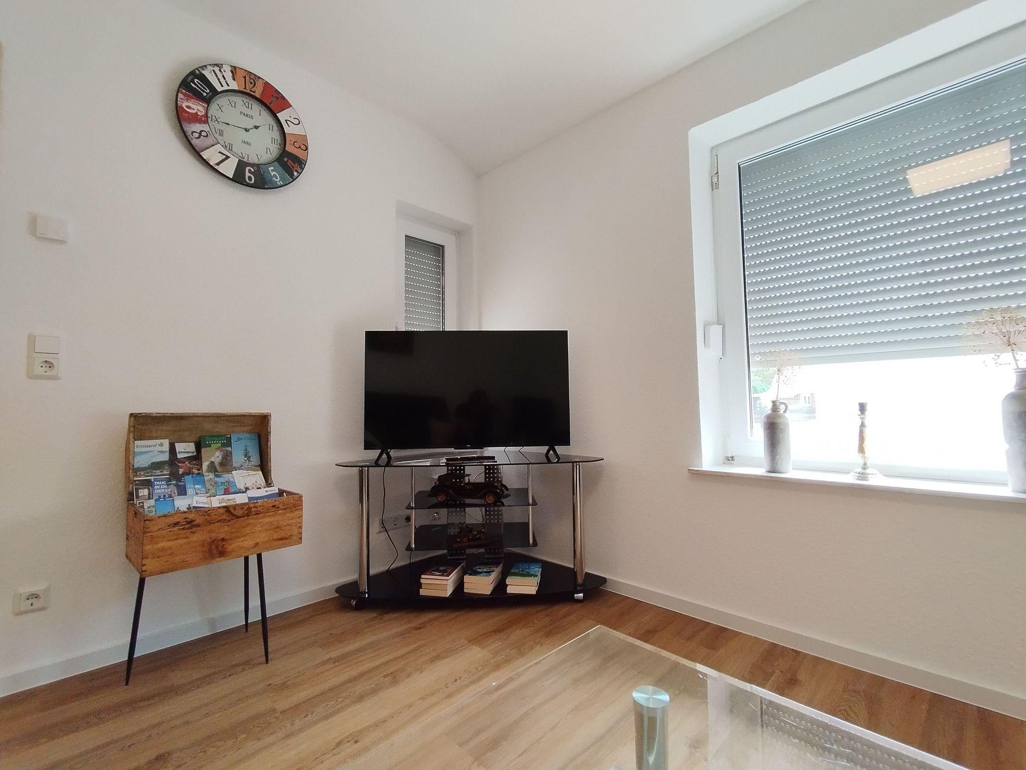 Wohnzimmer mit Sitzecke und Fernseher. Die Wohnung ist mit einer Fußbodenheizung ausgestattet (Flur und Schlafzimmer zwei sind mit Heizkörpern ausgestattet.)