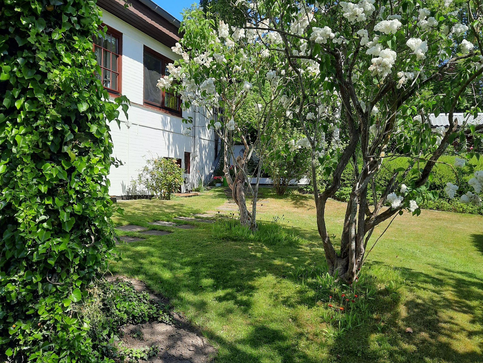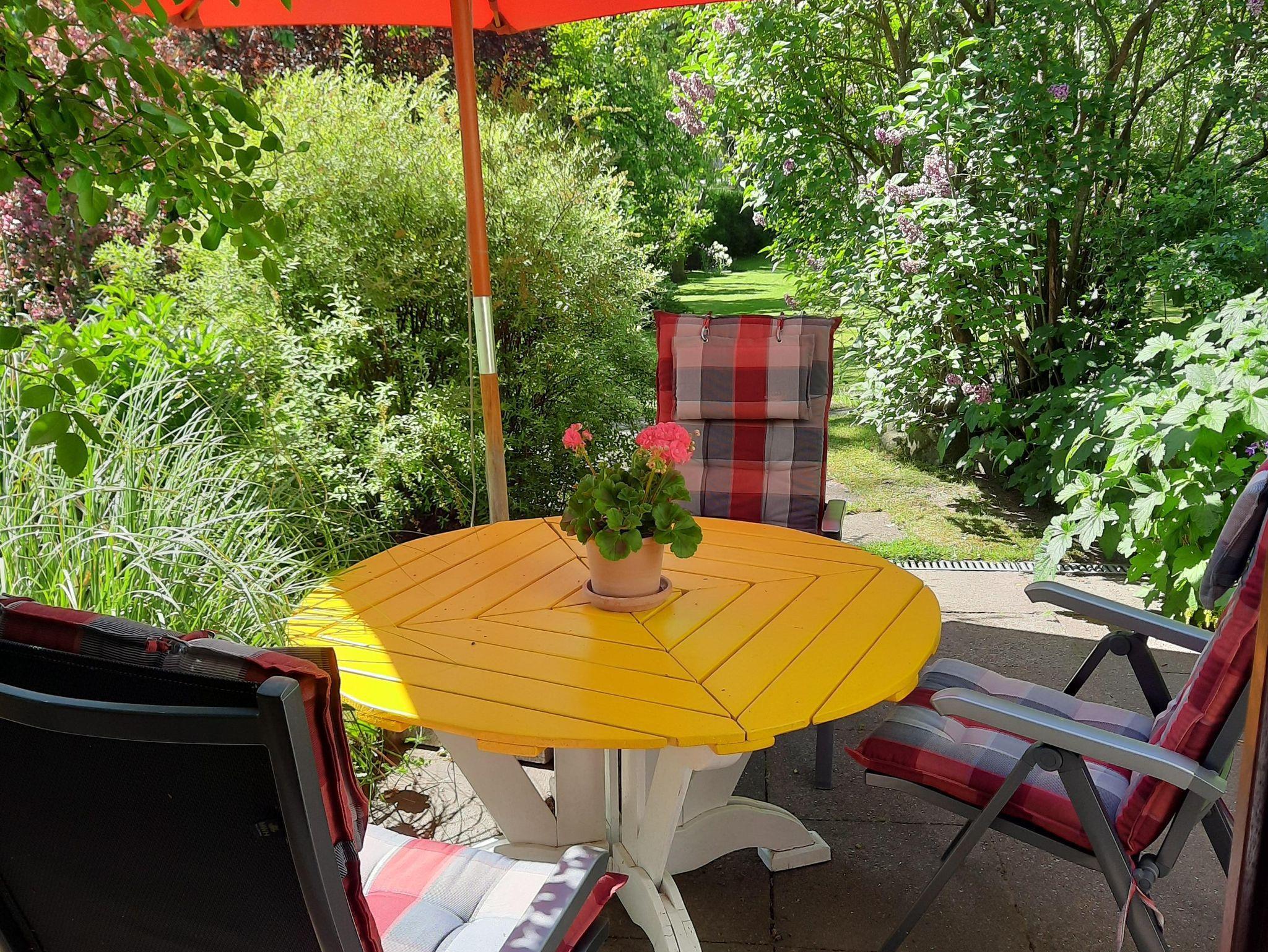 • 1 Terrasse mit Tisch und Stühlen und Blick in den großen Garten