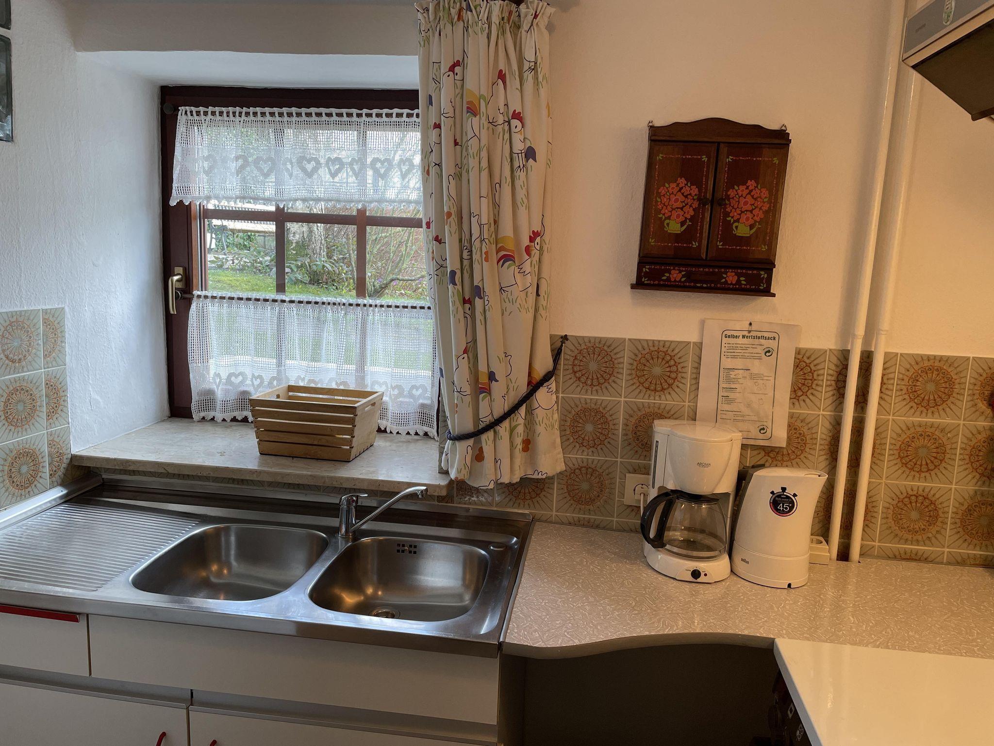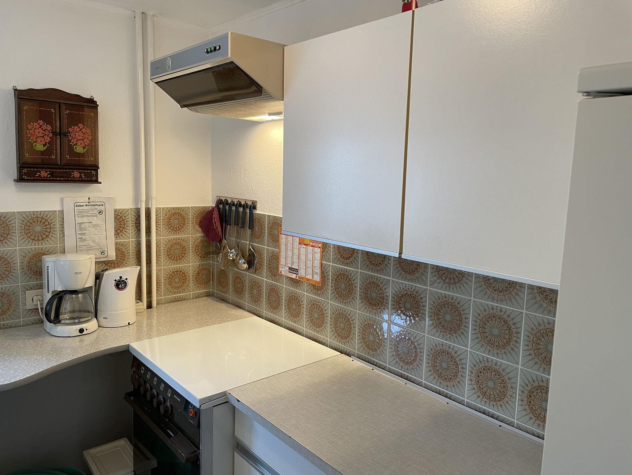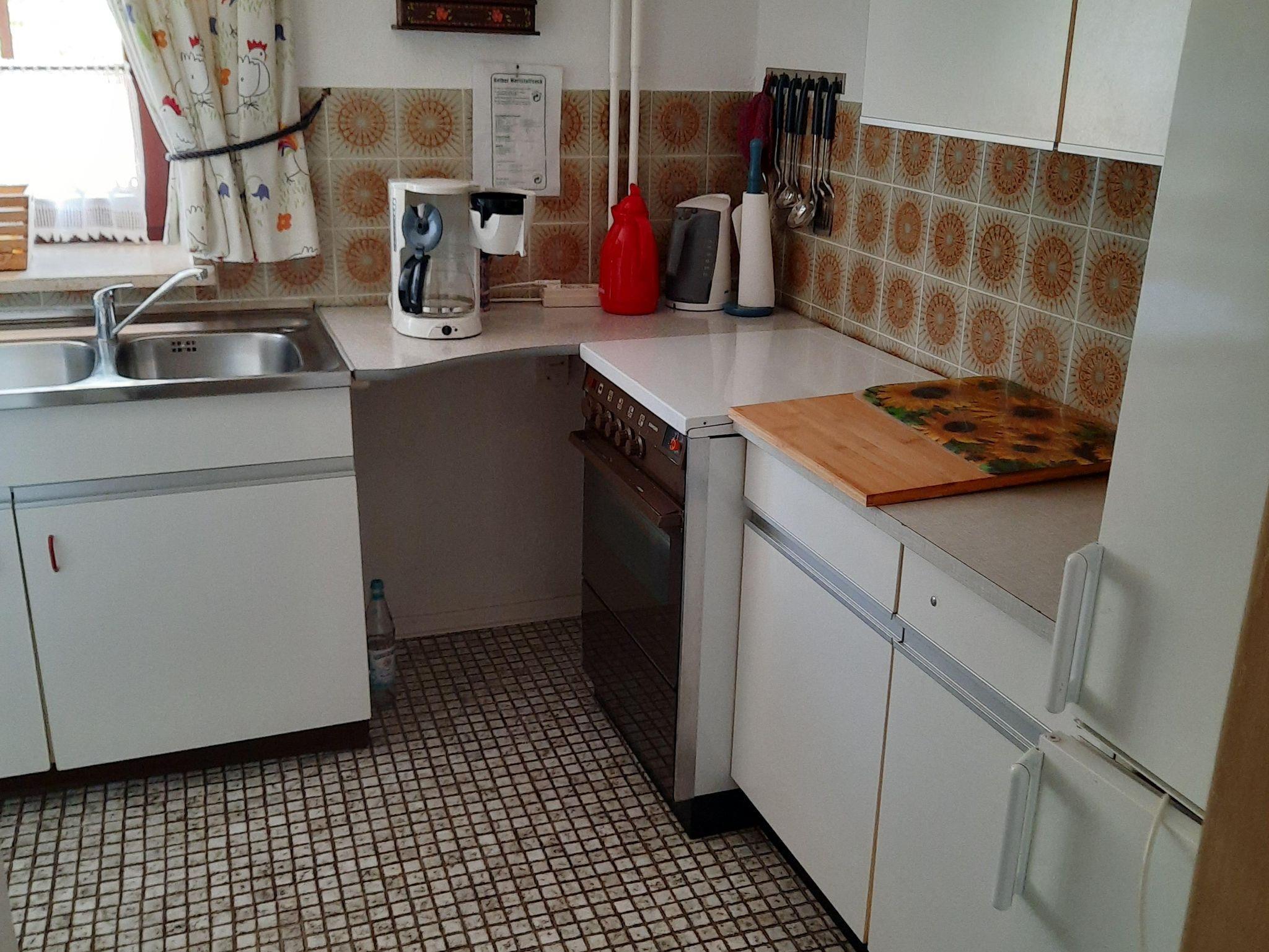 • 1 Küche mit Kühl-/Gefrierschrank, Mikrowelle, E-Herd/Ober-und Unterhitze und Kochfelder, Doppelspüle, Schränke