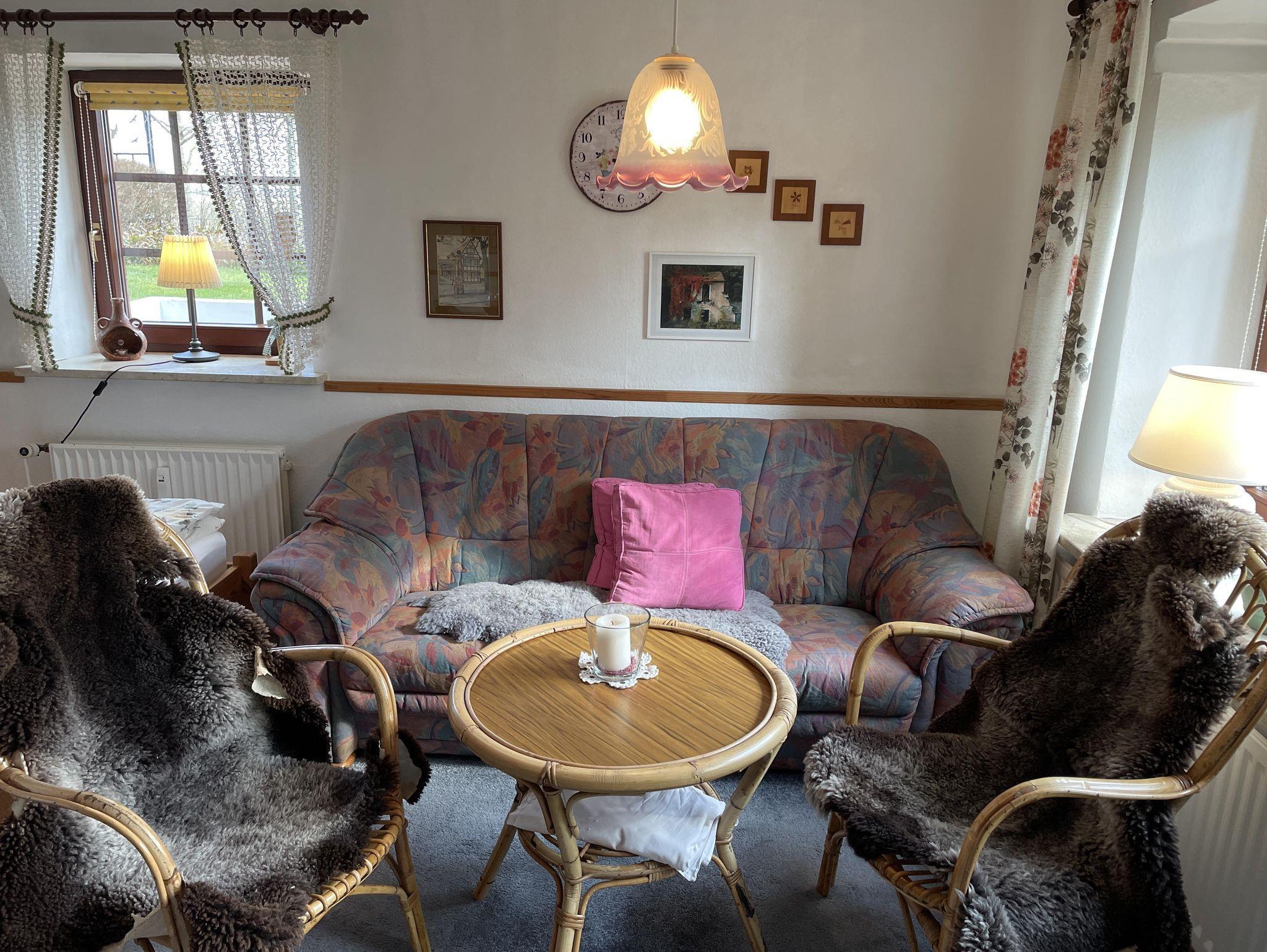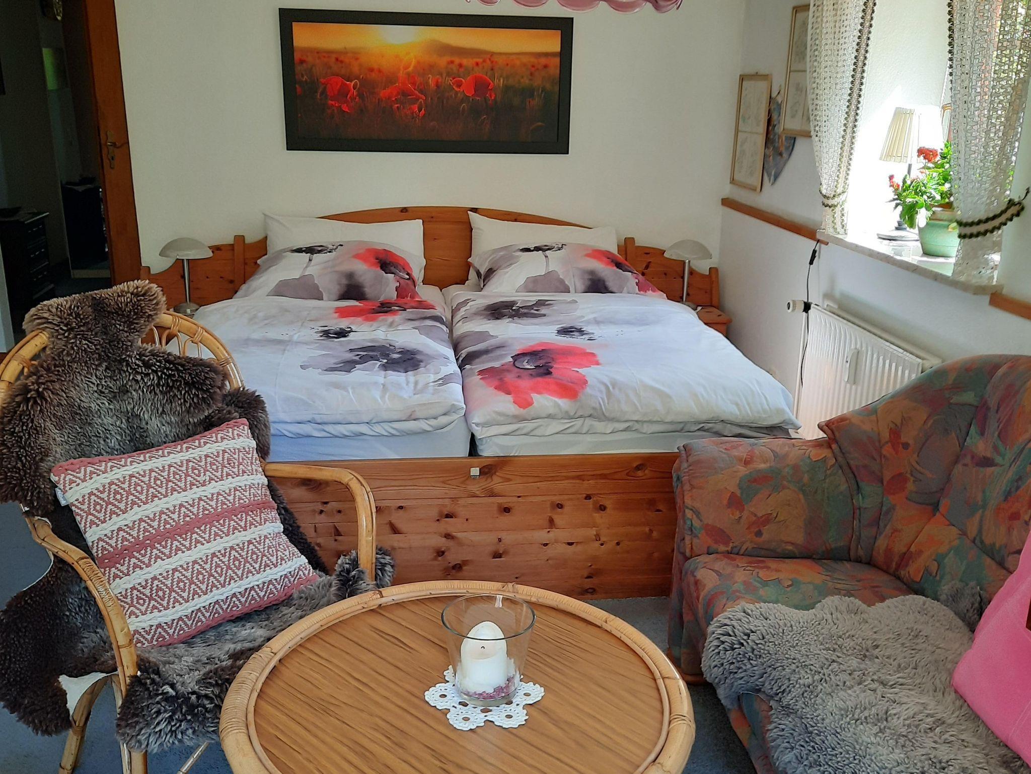 • 1 Wohn-/Schlafraum mit Doppelbett (180 x 200cm), Sofaecke mit Dreisitzer und 2 Korbstühlen, Esstisch mit 2 Stühlen, TV, DVD-Player