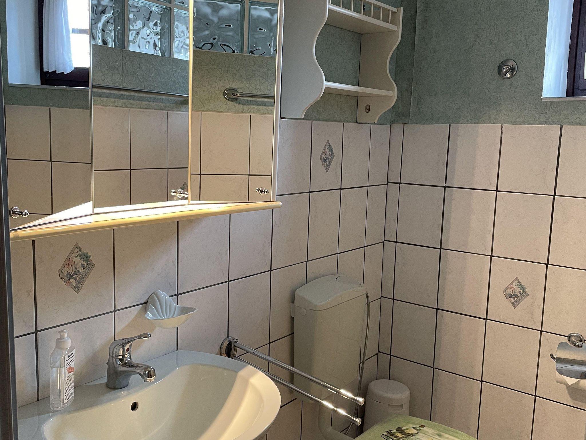 • 1 Badezimmer mit Dusche, Waschbecken, Spiegelschrank, Handtuchschrank, WC