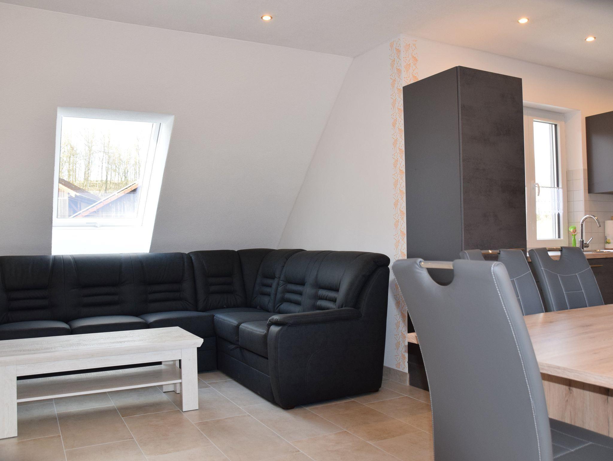 Die Ferienwohnung ist ca. 85 m² groß und befindet sich im 1. Stock des Nebengebäudes. Sie können mit bis zu 6 Personen bei uns übernachten. Die Wohnung verfügt über eine voll eingerichtete Einbauküche mit Kühlschrank, Gefrierschrank, Spülmaschine und Elektroherd mit Glaskeramikkochfeld, Mikrowelle; diverse Kleingeräte sind auch vorhanden. Im komibinierten Ess- und Wohnbereich befindet sich ein Esstisch mit sechs Stühlen. Das Wohnzimmer ist mit einem Ecksofa und TV ausgestattet. Die angrenzende Dachloggia nach Süden mit Sitzgelegenheit ist das Highlight der Wohnung.