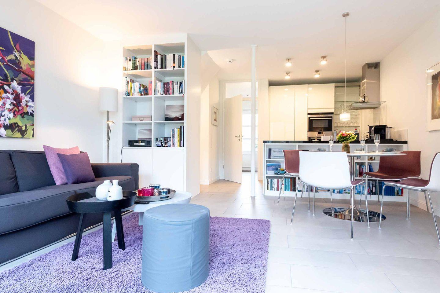 Wohn-/Koch-/Essbereich: Offene, moderne Küche, perfekt ausgestattet bis ins Detail, sowie eine bequeme Essgruppe. Der gemütliche Loungebereich mit Flachbildschirm und Lese-Sessel, lädt zum Entspannen ein. Von hier betreten Sie auch die nach Südwesten gelegene Terrasse mit edlem Gartenmobiliar und einem Saison-Strandkorb.