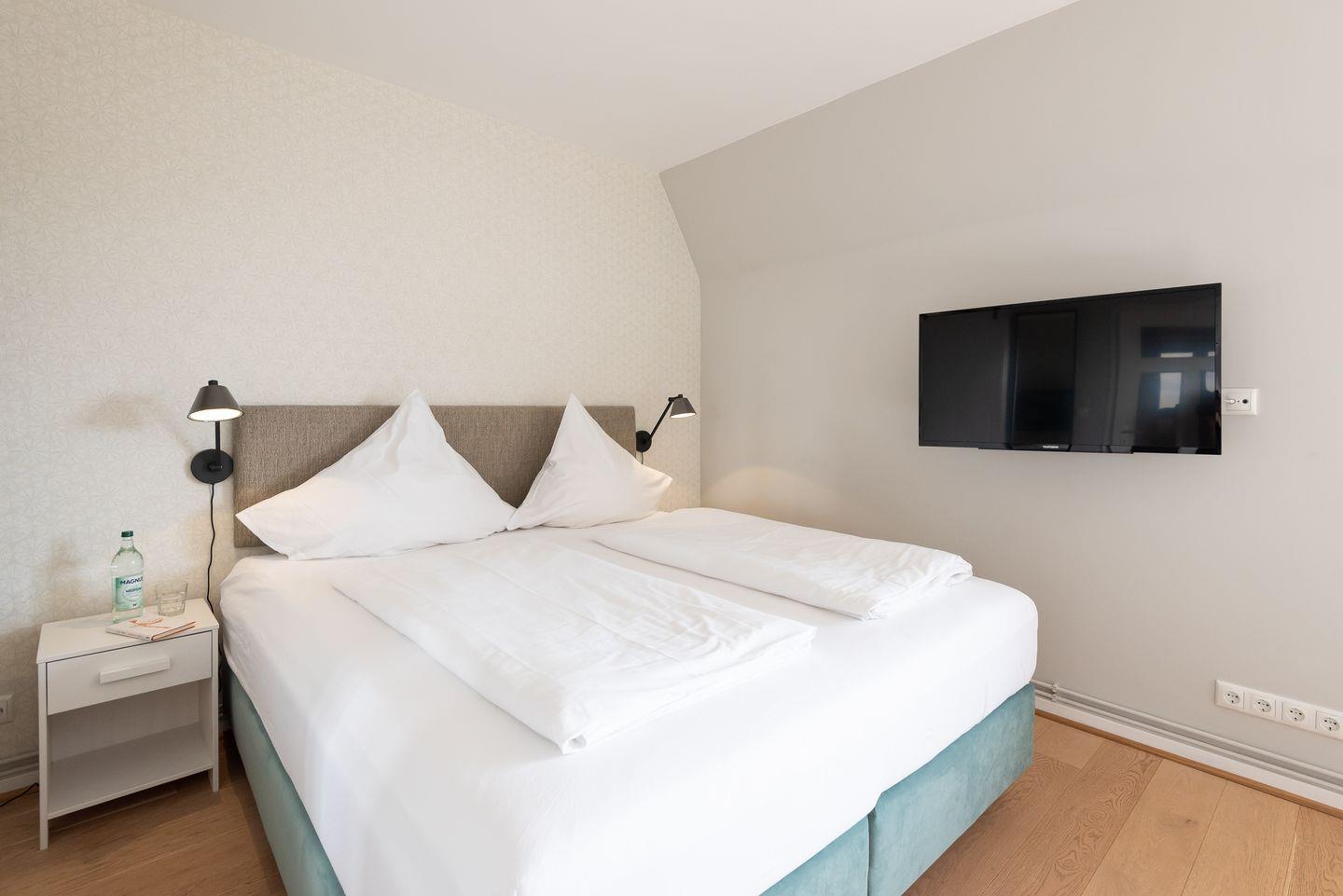 Wohn-/Schlaf-/Essbereich: Geschickt eingerichtetes Zimmer mit Panoramablick über die Wiesen und Felder. Der Schlafbereich ist mit einem Boxspringbett ausgestattet. Der kleine Essplatz vor dem Fenster und das bequeme Zweisitzer-Sofa laden zum Verweilen ein.