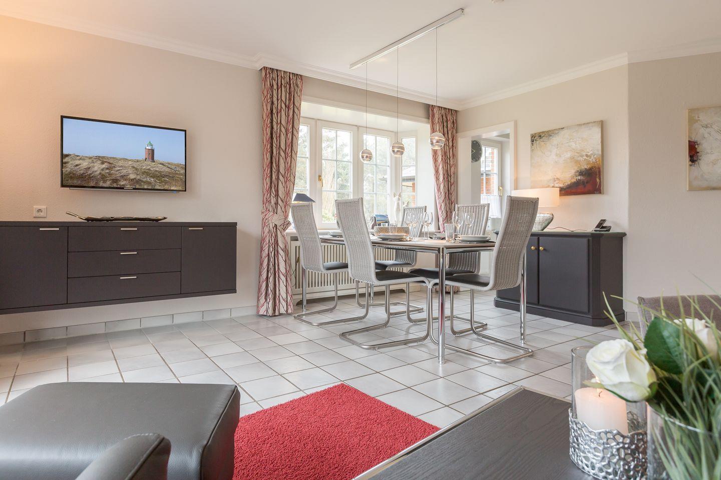 Dieses Appartement im Enen-Neest ist ein wahr gewordener Ferientraum auf 85 m². Die Wohnung ist lichtdurchflutet und modern eingerichtet. Vom großzügigen Wohnbereich aus erreichen Sie Ihre möblierte Wohlfühlterrasse mit Blick in den großen Garten, auf der Sie die Sylter Sonnentage genießen können.
