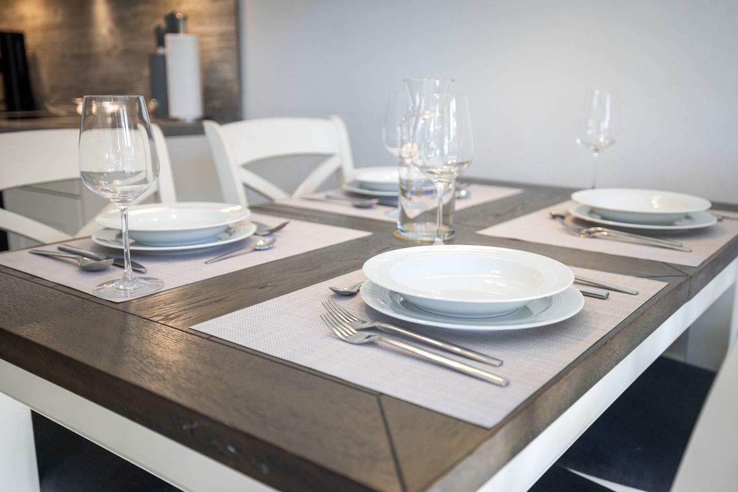 Der Wohnraum des Appartements bietet Ihnen eine gemütliche Couchecke mit Sessel zum Entspannen, einen Essbereich für vier Personen und eine offene Küchenzeile, die mit Ceranfeld, Backofen, Geschirrspülmaschine und Nespresso-Maschine ausgestattet ist. Bereiten Sie sich Ihr Urlaubsfrühstück zu und genießen Sie es auf Ihrer privaten Terrasse, die von April bis Oktober möbliert ist. Durch die ruhige Lage des Hauses können Sie hier ungestört die Sylter Nordseeluft genießen. Auf gleicher Ebene zum Wohnraum befindet sich ein Gäste-WC.