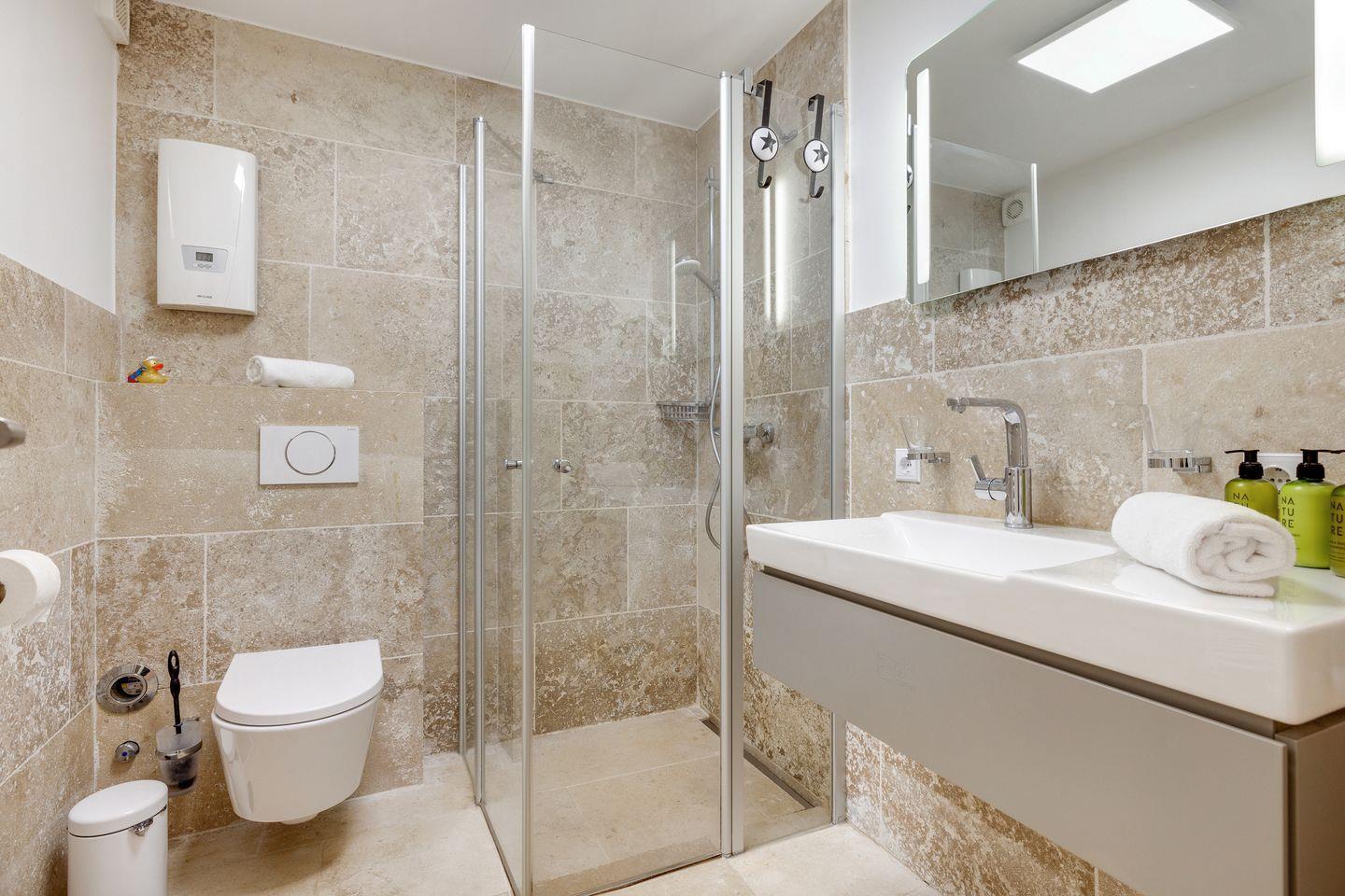 Im Untergeschoss des Hauses finden Sie einen Raum mit Doppelbett und Flatscreen-TV sowie einen weiteren Raum mit zwei Einzelbetten und Flatscreen-TV. Auf dieser Etage finden Sie außerdem ein Badezimmer mit Dusche und WC.