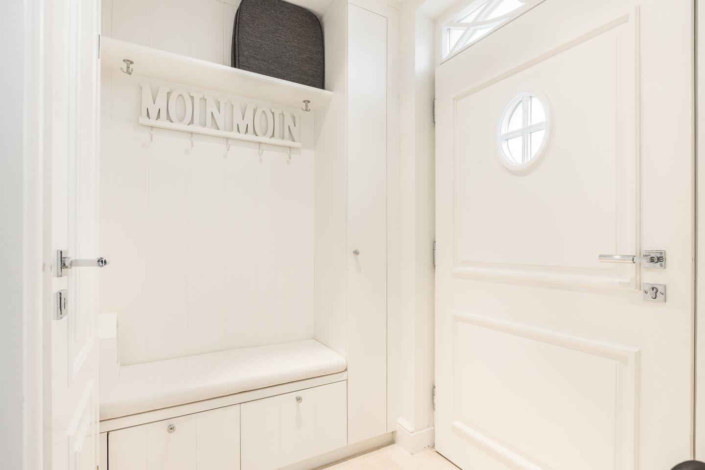 Die Küche des Hauses ist offen gestaltet, aber geschickt vom Wohnbereich abgetrennt. Die Ausstattung ist natürlich auch hier modern, luxuriös und lässt keine Wünsche offen. Ob Backofen, Geschirrspülmaschine oder Nespresso-Maschine – hier müssen Sie auf nichts verzichten. Im Eingangsbereich des Hauses finden Sie außerdem ein schickes Gäste-WC und ausreichend Platz an der Garderobe mit Sitzmöglichkeit.