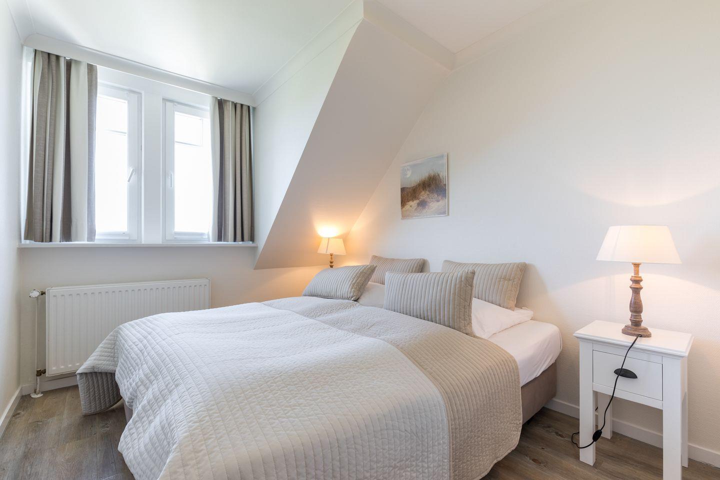 Im Obergeschoss empfängt Sie der Masterbedroom mit Doppelbett (ca. 1,80 x 2,00 m) und En-Suite Bad mit Badewanne und WC. Darüber hinaus steht Ihnen ein weiteres Schlafzimmer mit 2 Einzel Boxspringbetten zur Verfügung, die bei Bedarf auch zu einem Doppelbett (ca. 1,80 x 2,00 m) zusammengestellt werden können. Benachbart finden Sie ein großes Bad mit Dusche, WC und Waschmaschine vor.
