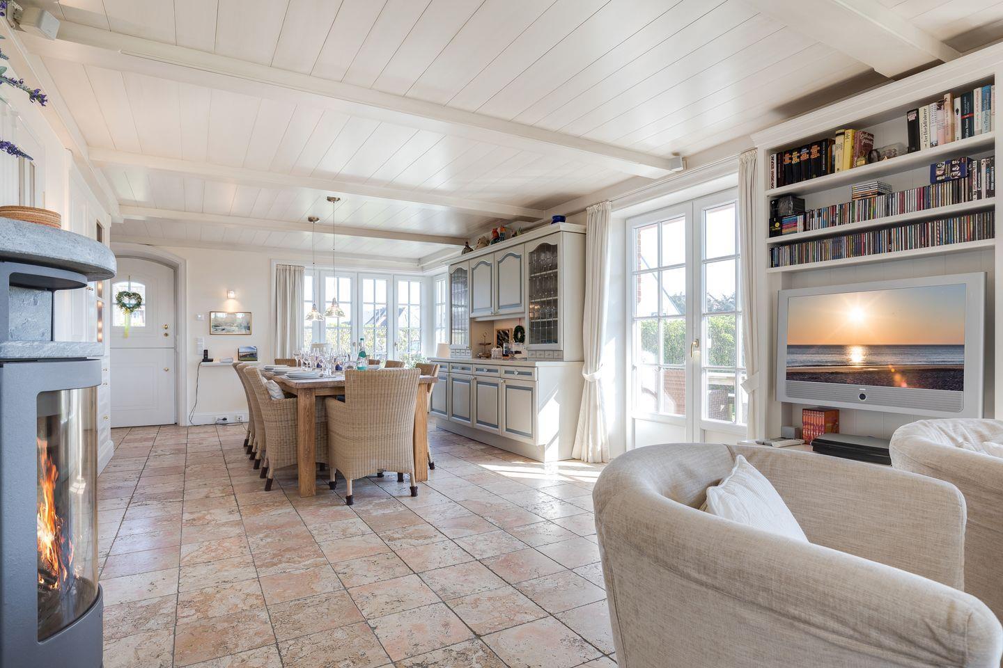 EG: Großzügiger, lichtdurchfluteter Wohnraum mit wunderschöner großer Esstafel. Schöne Sitzecke mit Flat-TV und BOSE-Hifi. Ipod Dock. Optisch getrennte, großzügige Küche mit überkompletter Ausstattung. Gäste-WC mit Dusche. Desweiteren befindet sich im Erdgeschoss ein Raum, den man ideal als Rückzugsort zum Lesen, Arbeiten, Relaxen oder Tagträumen nutzen kann. Sehr schöner Open-Air Bereich mit großer Terrasse, Gartenmöbeln und Strandkorb (ca. von April–Oktober).