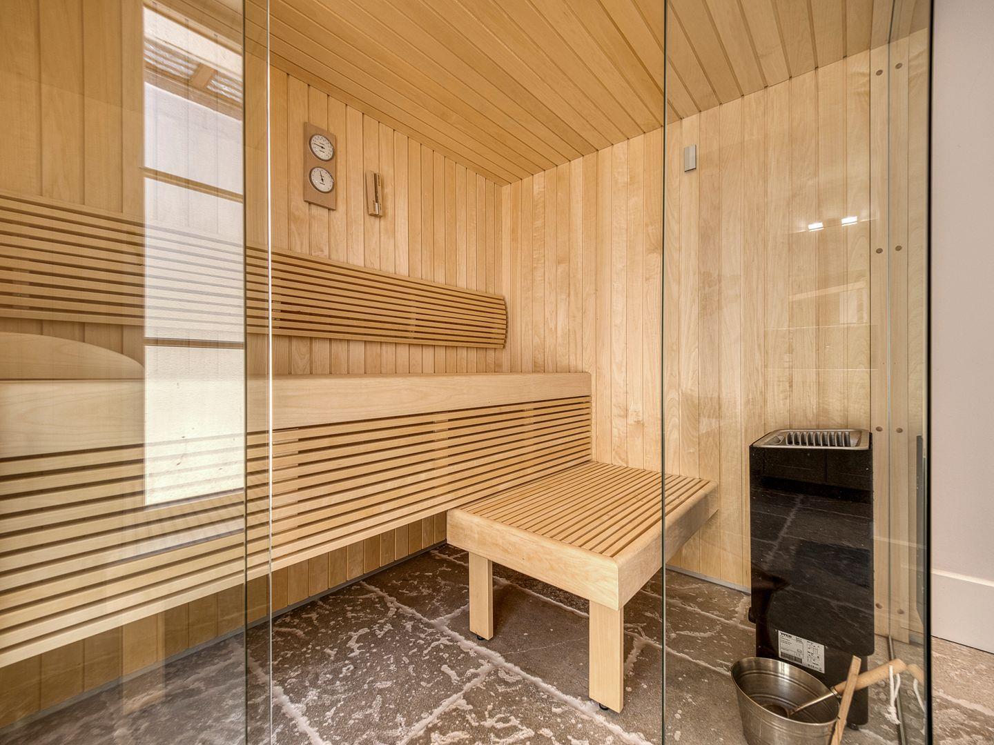 Drei helle und bodengleiche Duschbäder mit Regenduschkopf, Handtuchtrockner und Fenster. Eines der Badezimmer ist zusätzlich mit einer Badewanne ausgestattet und grenzt an die Sauna und einen kleinen Ruhebereich.