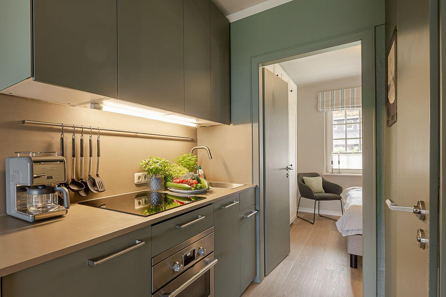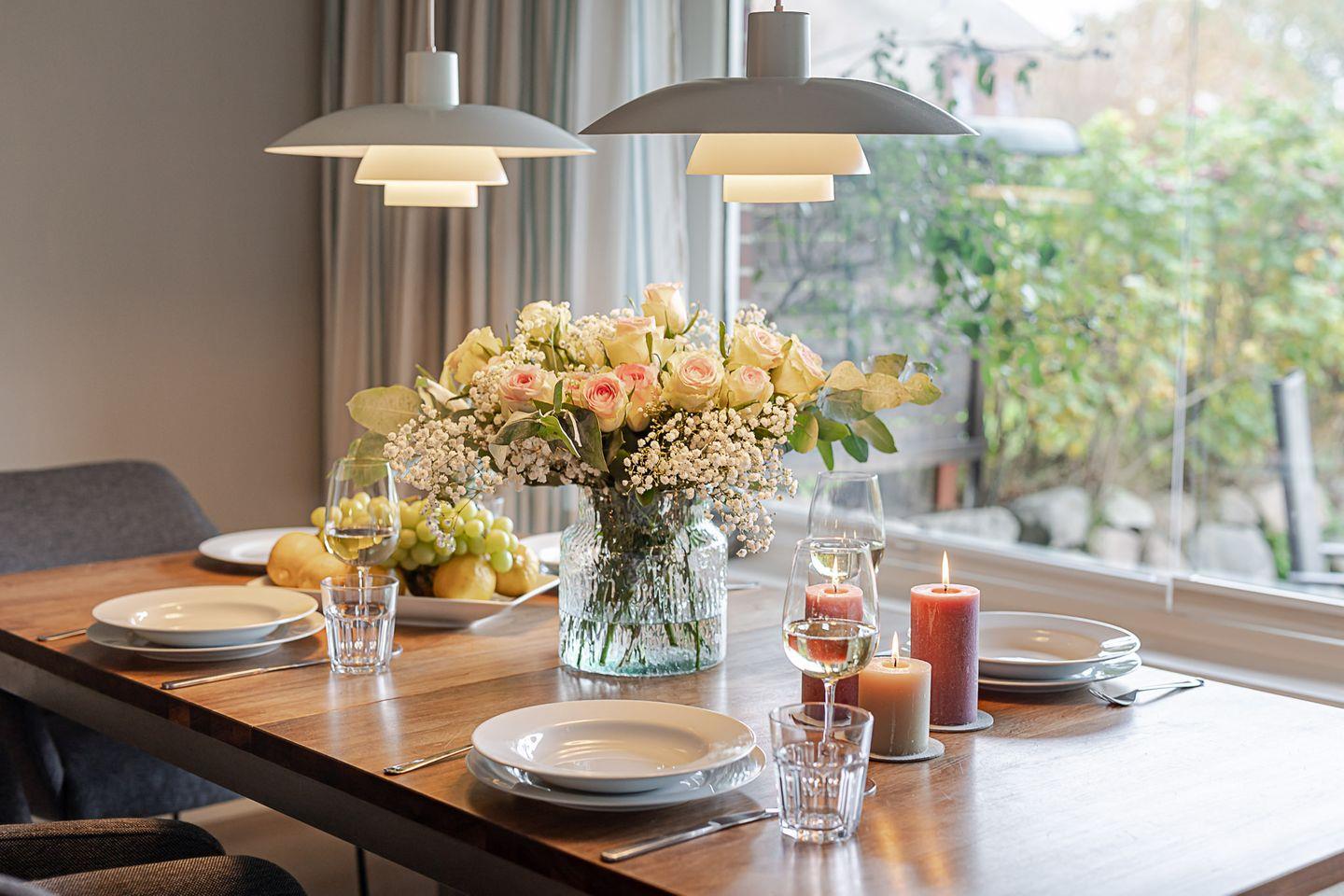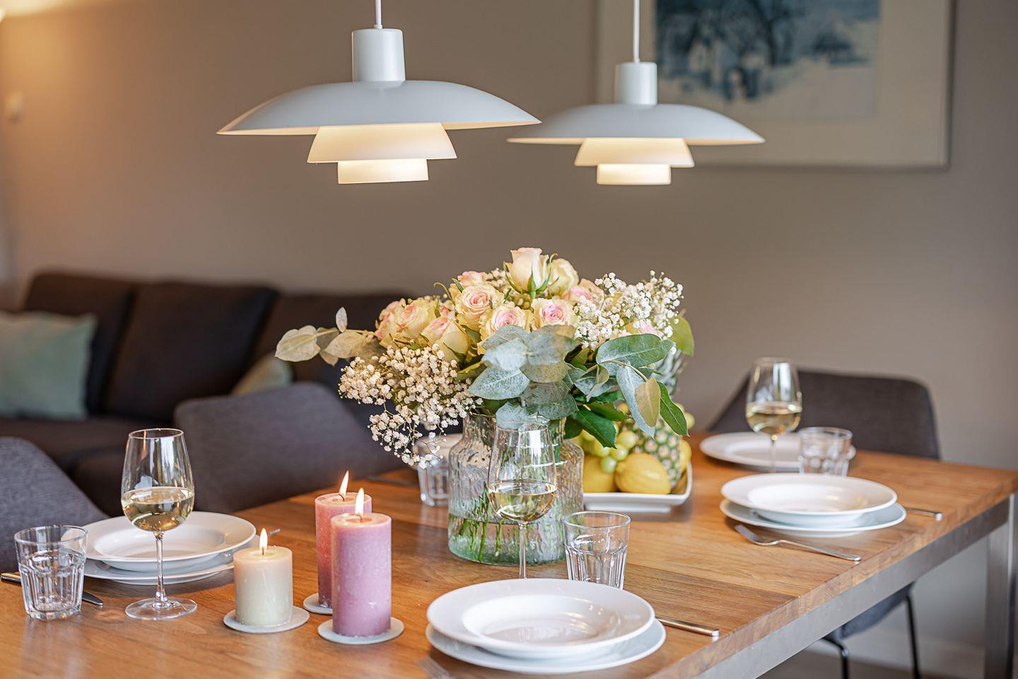 Im Erdgeschoss öffnet sich ein heller Wohn- und Essbereich, in dem nordische Zurückhaltung und gemütliche Eleganz perfekt harmonieren. Eine komfortable Sofalandschaft lädt zu entspannten Stunden ein, während der angrenzende Essplatz mit Blick in den Garten den idealen Rahmen für gemeinsame Mahlzeiten bietet. Die offene Küche ist modern ausgestattet – mit Spülmaschine, Backofen, Nespressomaschine und allem, was Sie für einen genussvollen Aufenthalt benötigen.