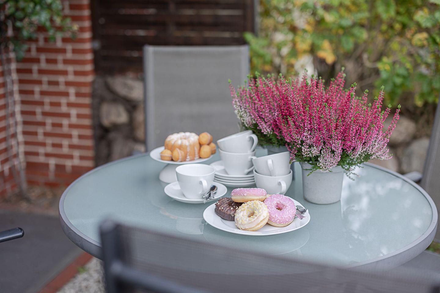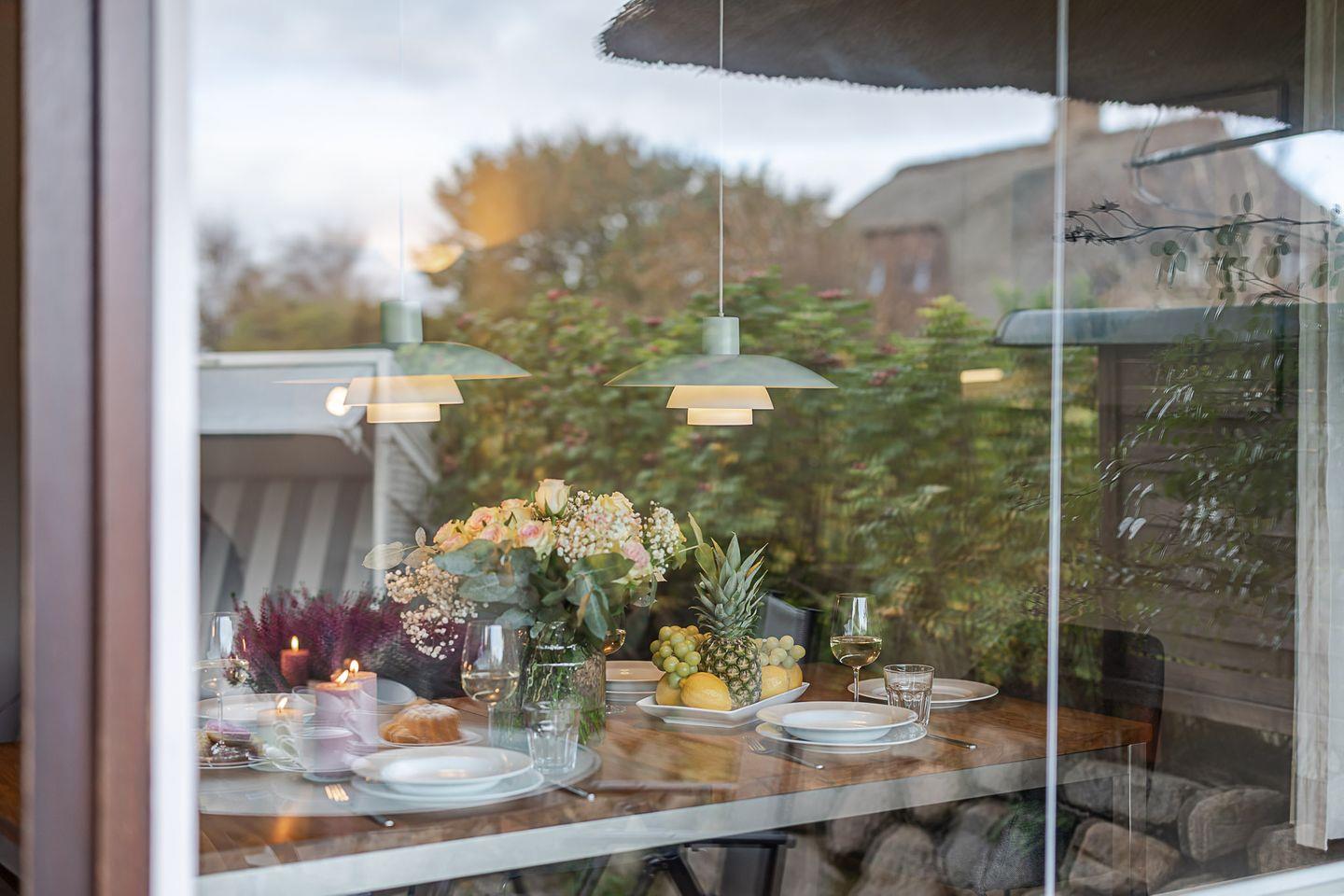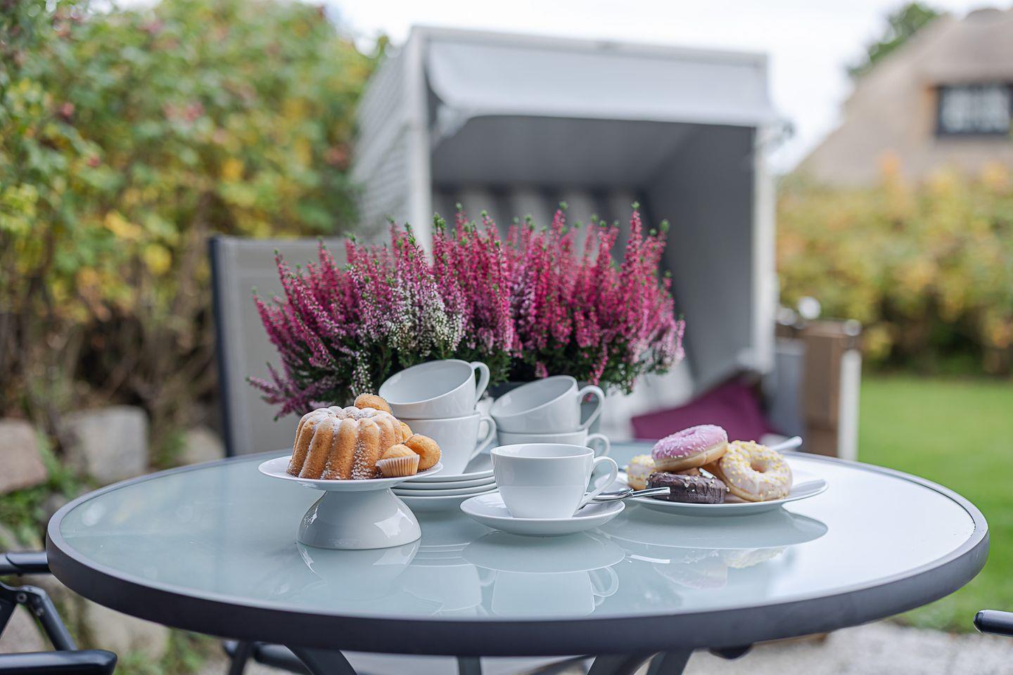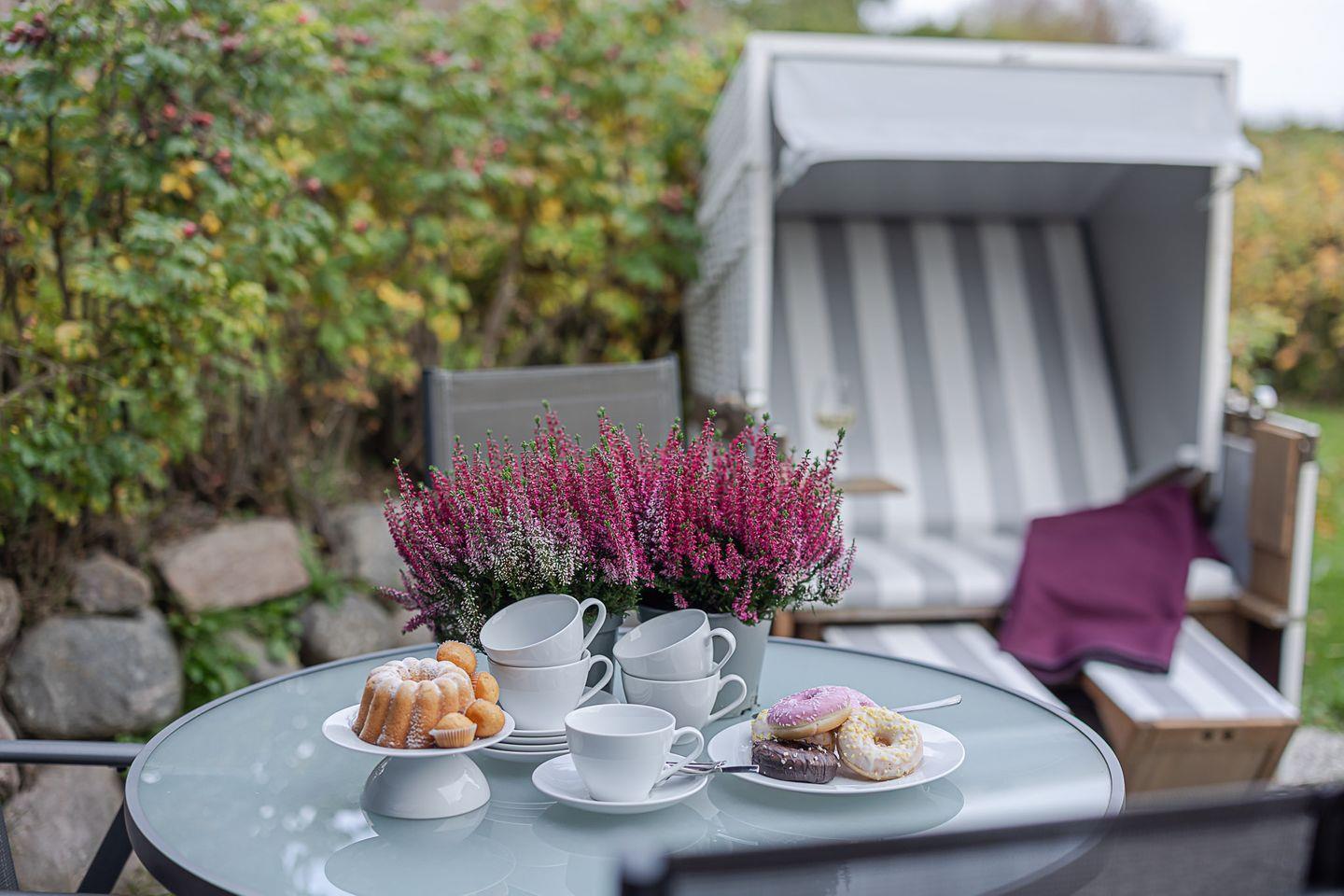 Von hier aus gelangen Sie auf die Terrasse zur Ostseite mit Gartenmöbeln und Strandkorb. In den frühen Stunden fällt hier das erste Licht des Tages ein – perfekt für ein Frühstück in der Sonne oder eine ruhige Tasse Kaffee, während die Insel langsam erwacht. Wer mag, legt sich auf die Wiese vor der Terrasse, lauscht dem Vogelgezwitscher und spürt die wohltuende Ruhe, die diesen Ort so besonders macht.