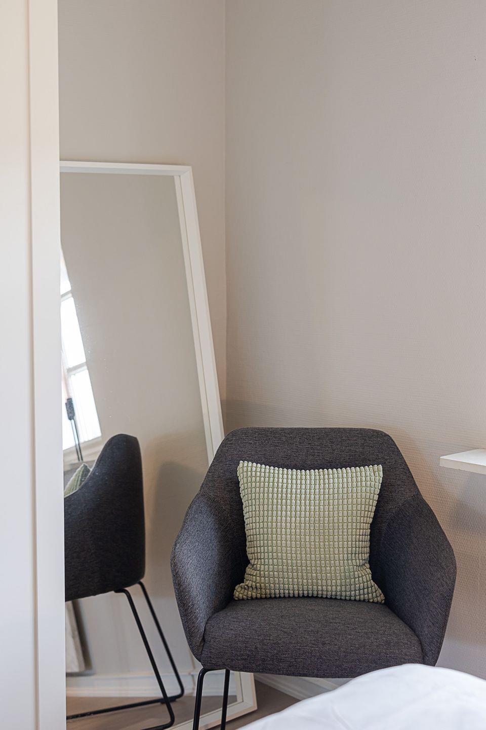 Im Erdgeschoss befindet sich ein liebevoll gestaltetes Schlafzimmer mit einem komfortablen Doppelbett (1,60 × 2,00 m). Das Zimmer ist hell, ruhig und mit einem geräumigen Kleiderschrank sowie einem großen Ganzkörperspiegel ausgestattet – ideal, um sich auch im Urlaub rundum wohlzufühlen.