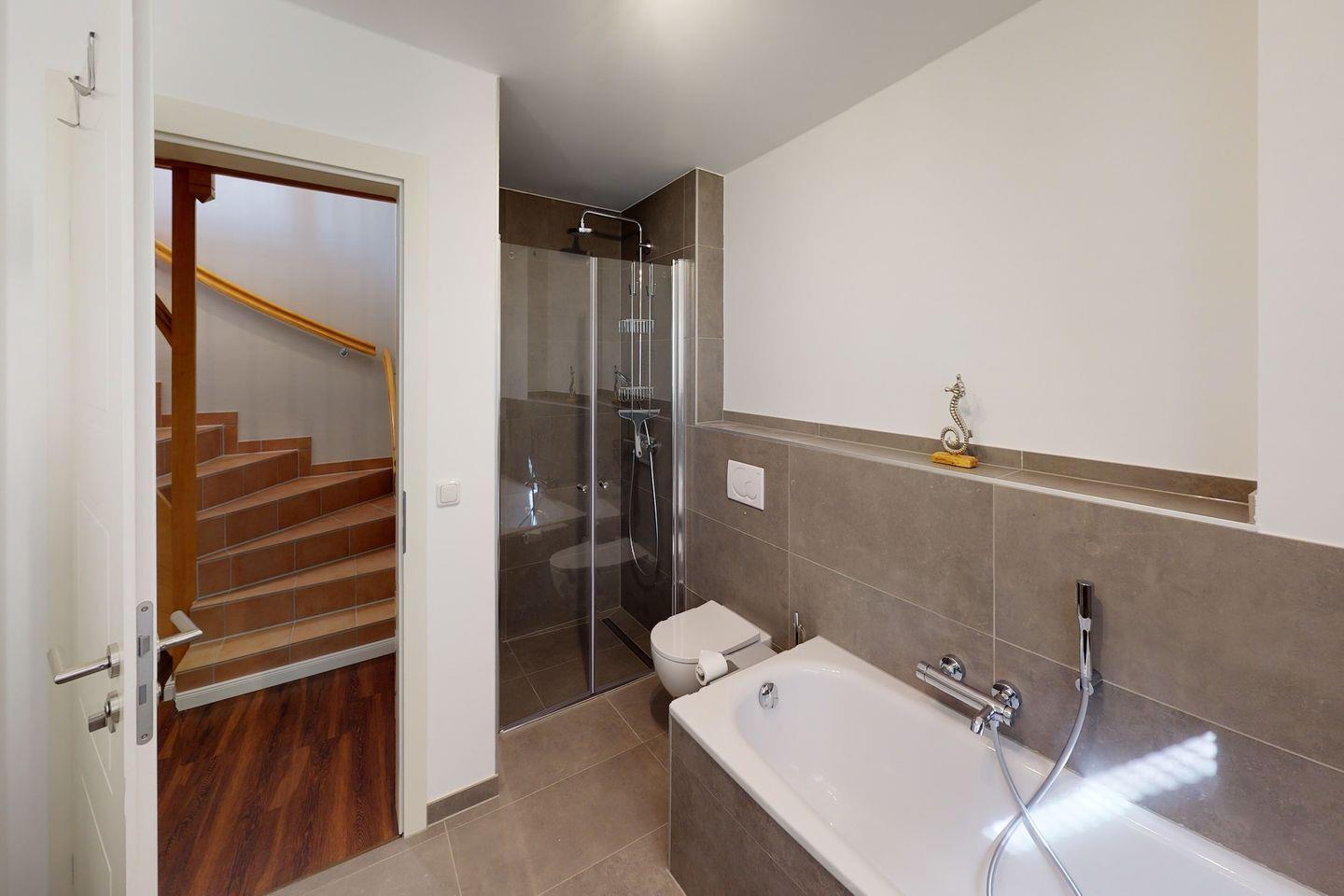 Badezimmer: Lichtdurchflutetes Badezimmer mit ebenerdiger Dusche und WC.