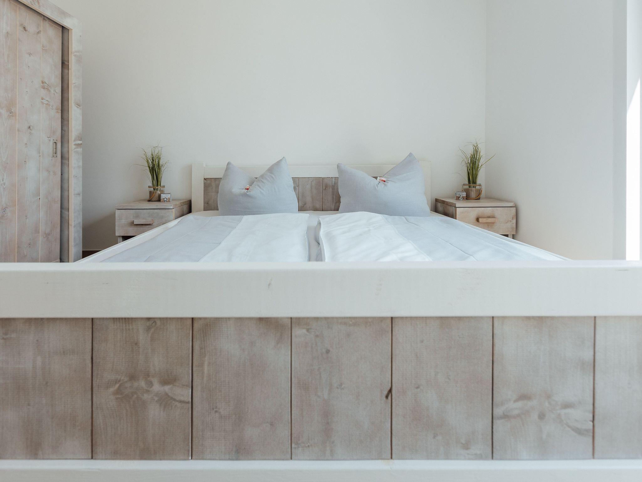 Die Ferienwohnung Inselblick bietet Platz für bis zu vier Personen. Sie ist auf zwei Etagen aufgeteilt. Im Erdgeschoss gibt es einen offenen Wohn- und Küchenbereich mit Essplatz und Zugang zur Terrasse. In der oberen Etage befinden sich ein Schlafzimmer mit Doppelbett, ein Schlafzimmer mit zwei EInzelbetten und ein Badezimmer mit Dusche und WC. Alle Einzelbetten haben jeweils eine Größe von 80x200 cm.