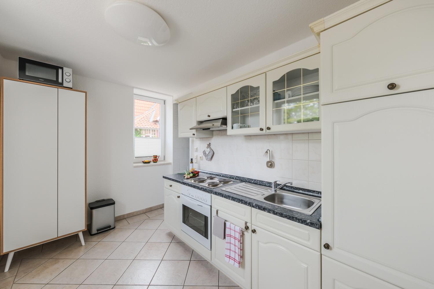 Ihre Nichtraucher-Unterkunft befindet sich Hochparterre, bietet ausreichend Platz für bis zu 4 Personen und draußen ein Plätzchen, das zum Verweilen einlädt. In den Schlafräumen, von denen einer ein Durchgangszimmer ist, finden Sie bequeme Boxspringbetten (200x200). Durch das helle Wohnzimmer mit Essplatz gelangen Sie in die Küche, die mit allem eingerichtet ist, um die Familie zu bekochen - Elektroherd mit Backofen, Kühlschrank mit Gefrierfach etc.