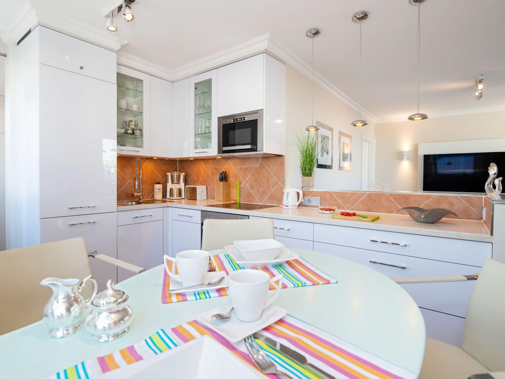 Die voll ausgestattete Küche lässt kaum Wünsche offen. Sie besitzt einen Herd mit Cerankochfeld (4 Felder) mit Backofen, einen Geschirrspüler, Mikrowelle, Kühlschrank mit Gefrierfach und eine Waschmaschine.