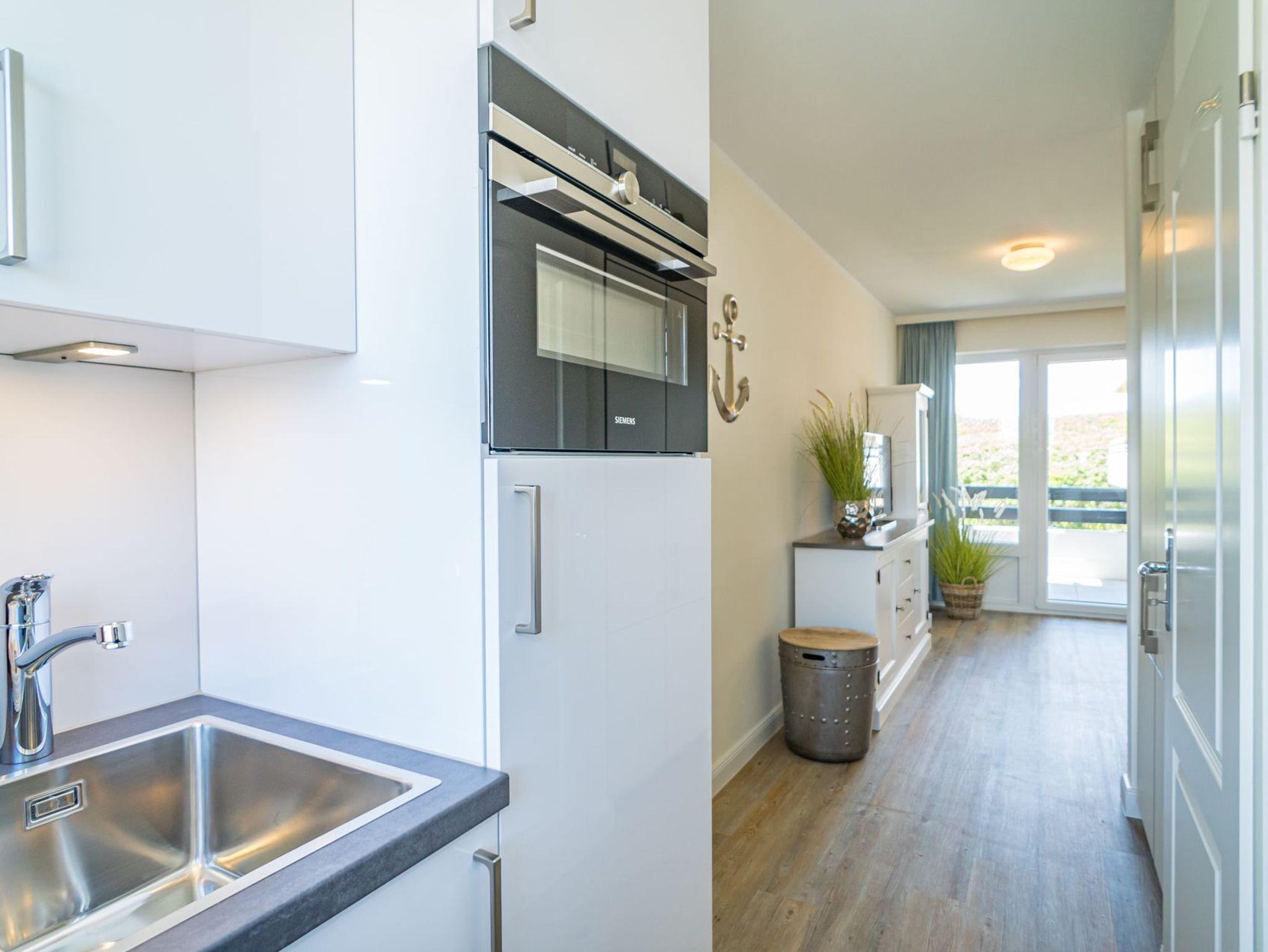 Beim Betreten der Wohnung gelangen Sie über den einladenden Vorflur mit Garderobe in den offenen Wohnbereich, der sich harmonisch in Wohn-, Schlaf- und Küchenbereich gliedert, sowie in das helle Duschbad/WC. Der Wohnbereich besticht durch ein modernes Schlafsofa (Liegefläche 150 x 190 cm), eine elegante Vitrine, ein stilvolles Sideboard und einen bequemen Armlehnstuhl. Ein separater Esstisch mit vier Stühlen lädt zu gemeinsamen Mahlzeiten ein. Für Ihre Unterhaltung sorgen ein Stereo-Radio, ein großer Flachbild-TV, ein Telefon mit Flatrate ins deutsche Festnetz und schnelles WLAN (100.000 MBit/s, ohne Garantie). Der Zugang zum Westbalkon ermöglicht Ihnen entspannte Stunden im Freien.