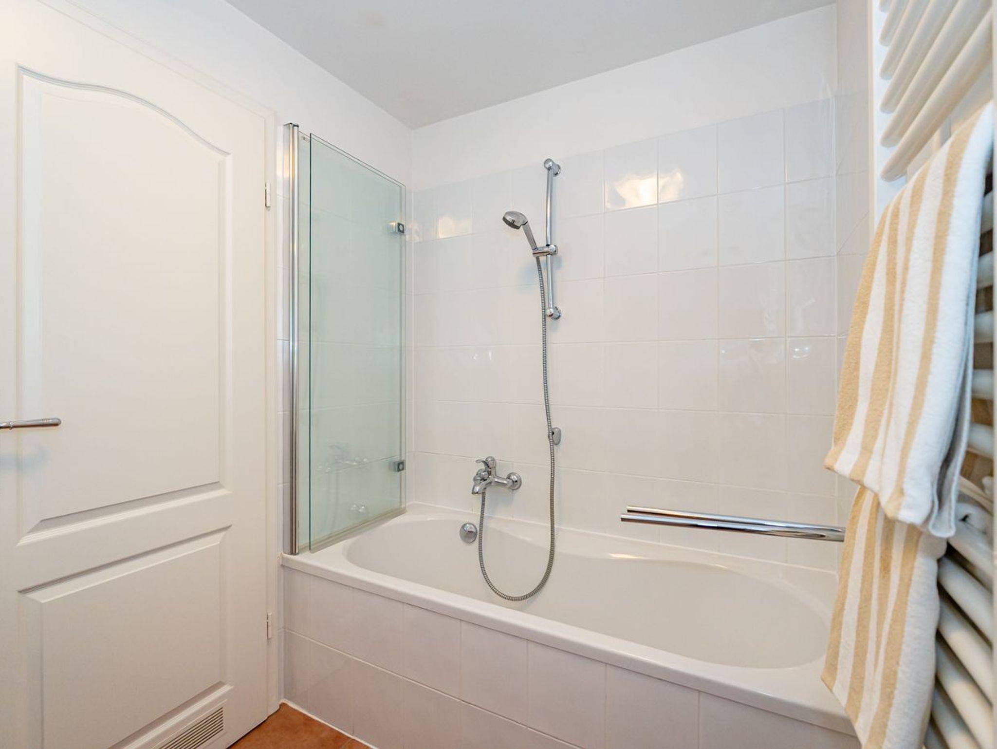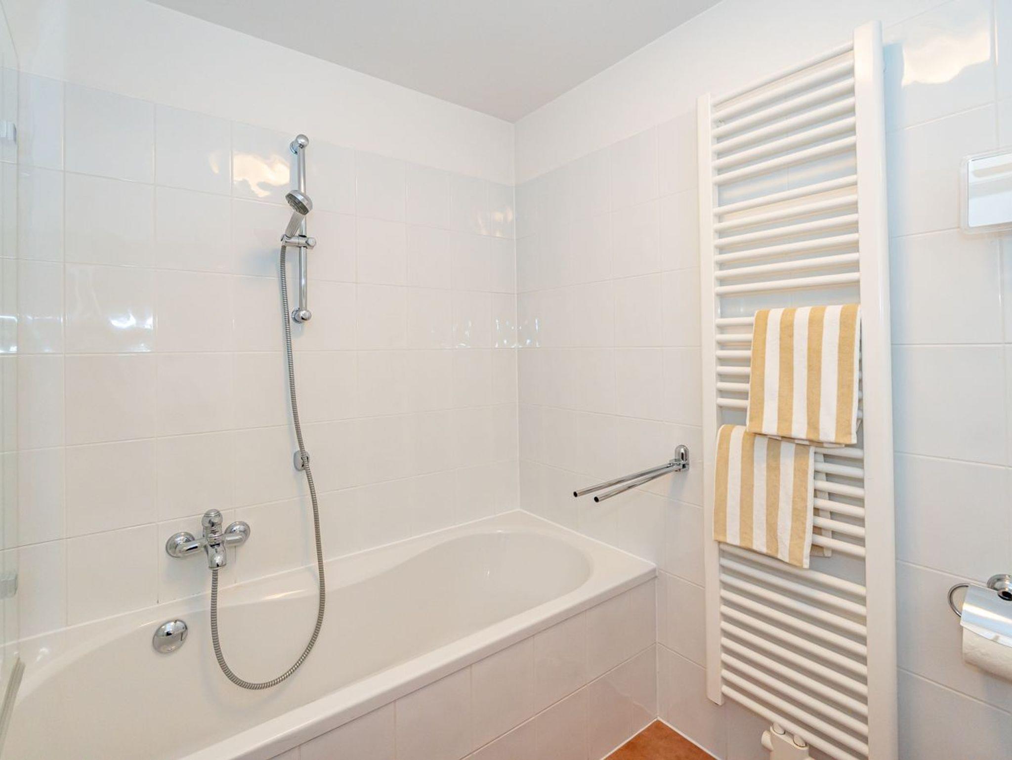 Das helle Wannenbad besitzt eine Badewanne mit Duschvorrichtung, Waschtisch, Handtuchtrockner, WC und Fön.