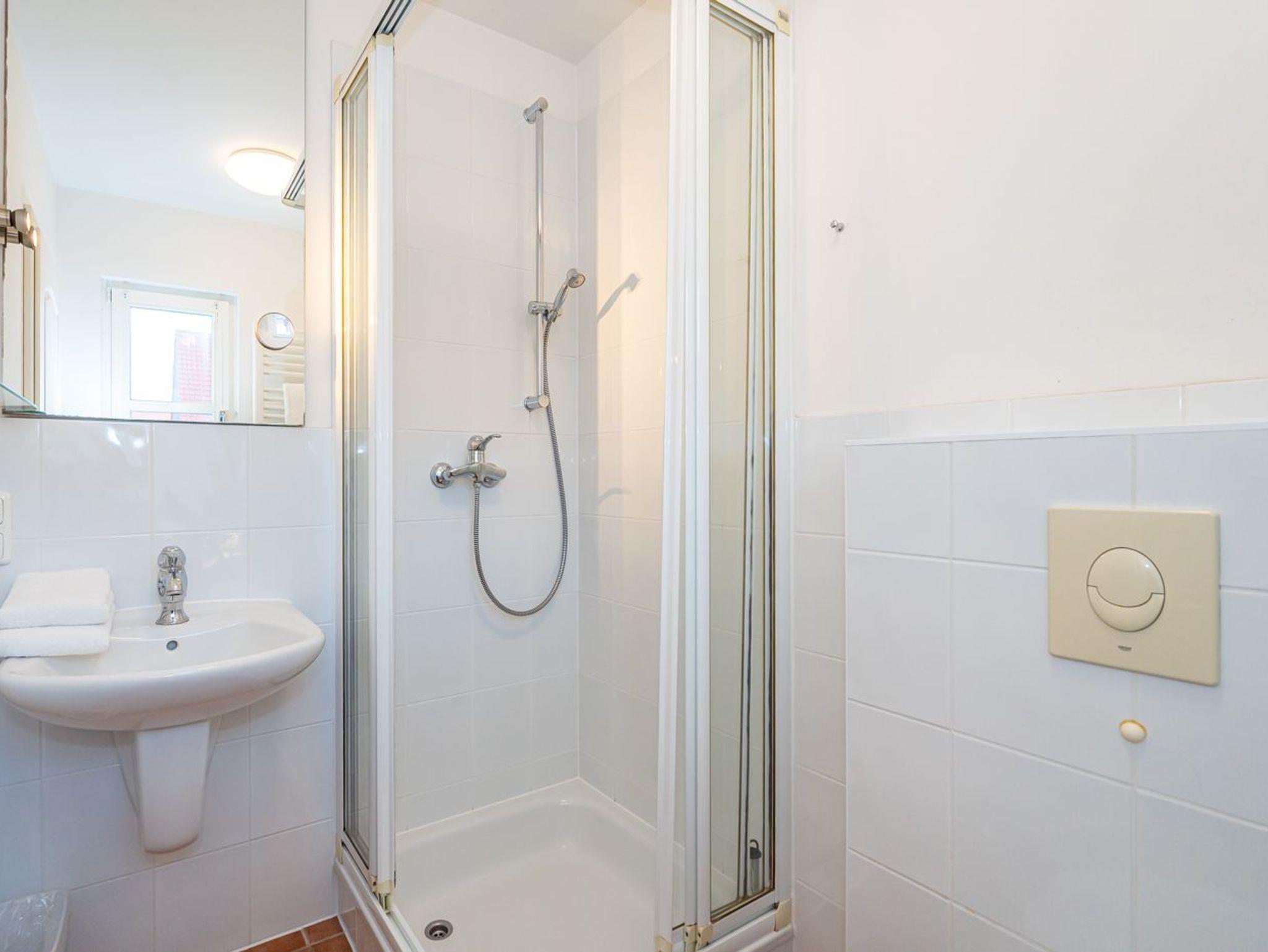 Das helle Badezimmer mit Fenster ist mit Dusche, Waschtisch, Handtuchtrockner, WC und Fön ausgestattet.