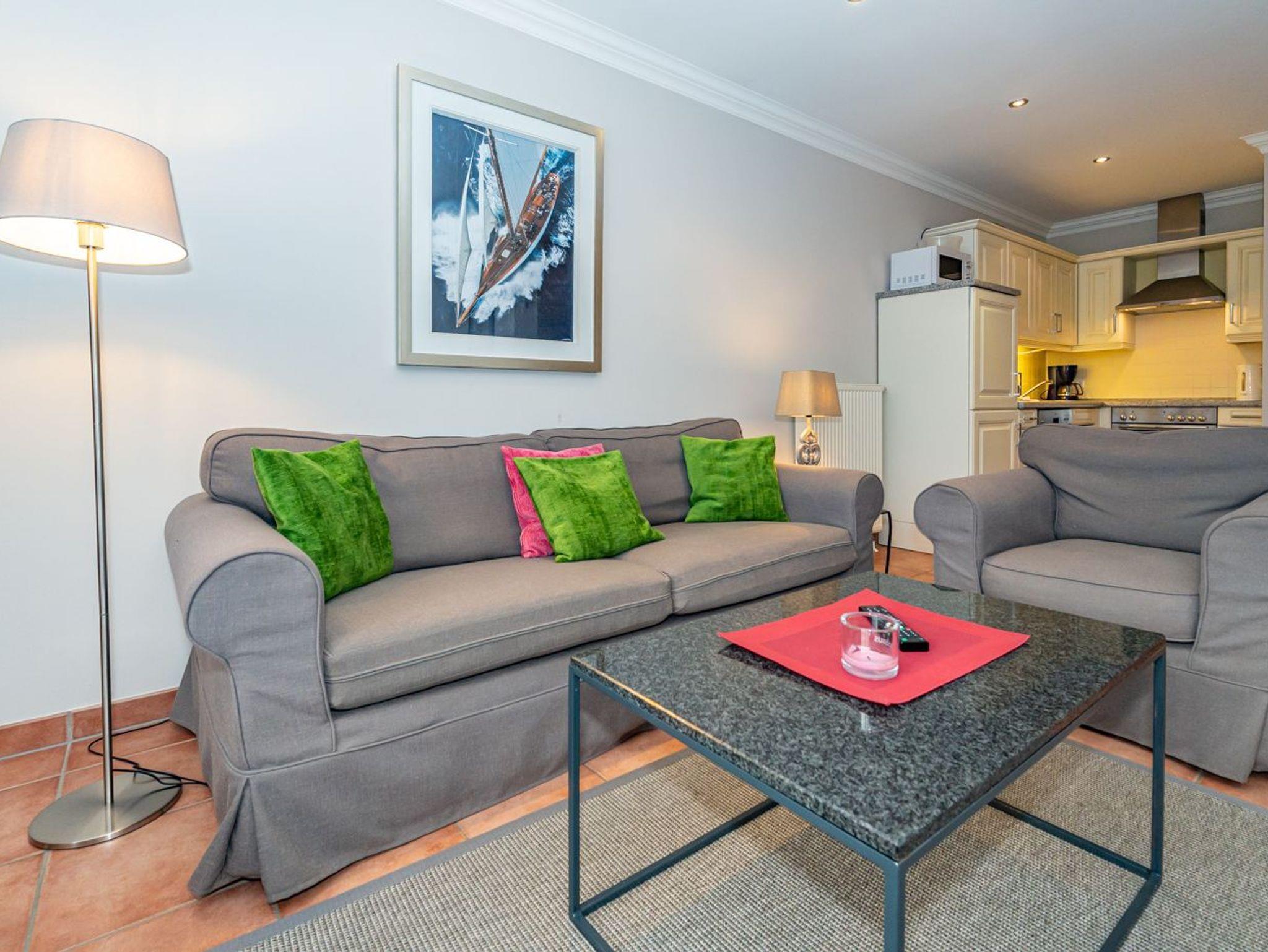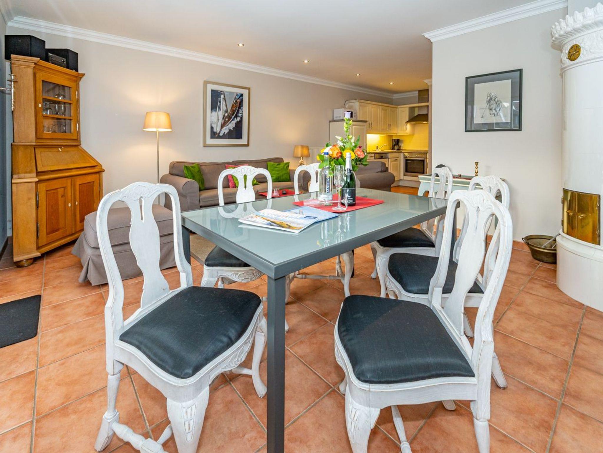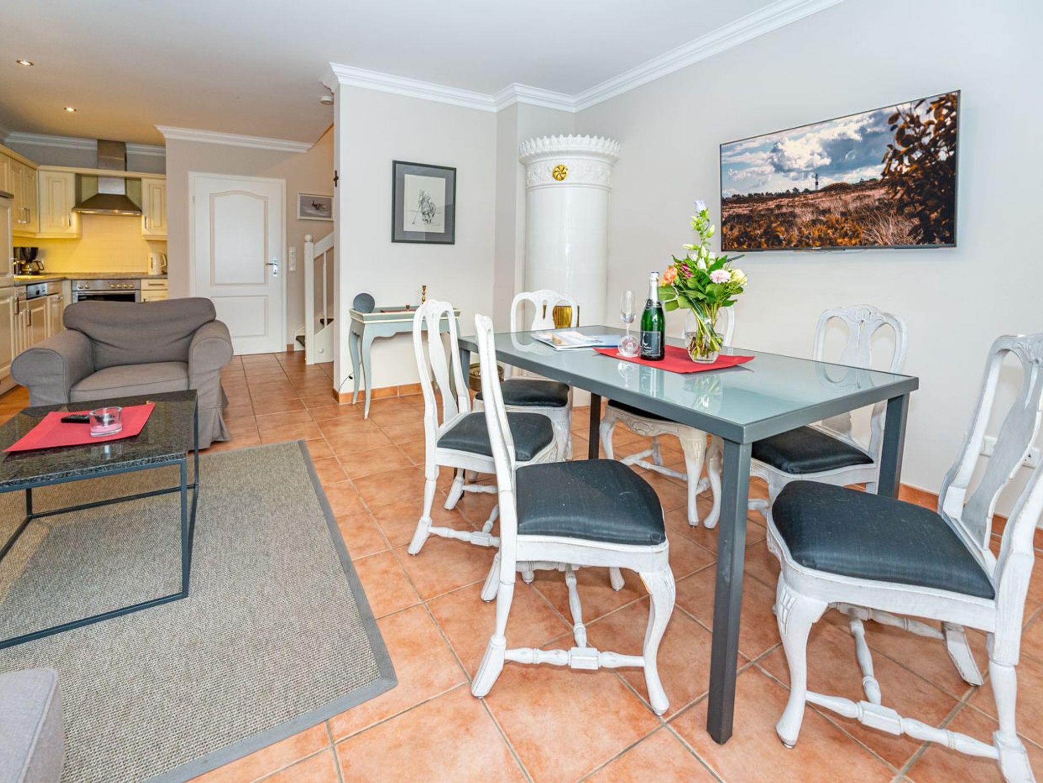 Das Wohnzimmer ist mit einer edlen Couchgarnitur (Zweisitzer-Couch und 1 Sessel mit Fußhocker), Essplatz für 6 Personen, weißem antiken Kachelofen, Kabel-Flachbild-TV, Radio/CD-Player und einer cremefarbenen Küche im Landhausstil ausgestattet. Kostenlose Internetnutzung per W-Lan.