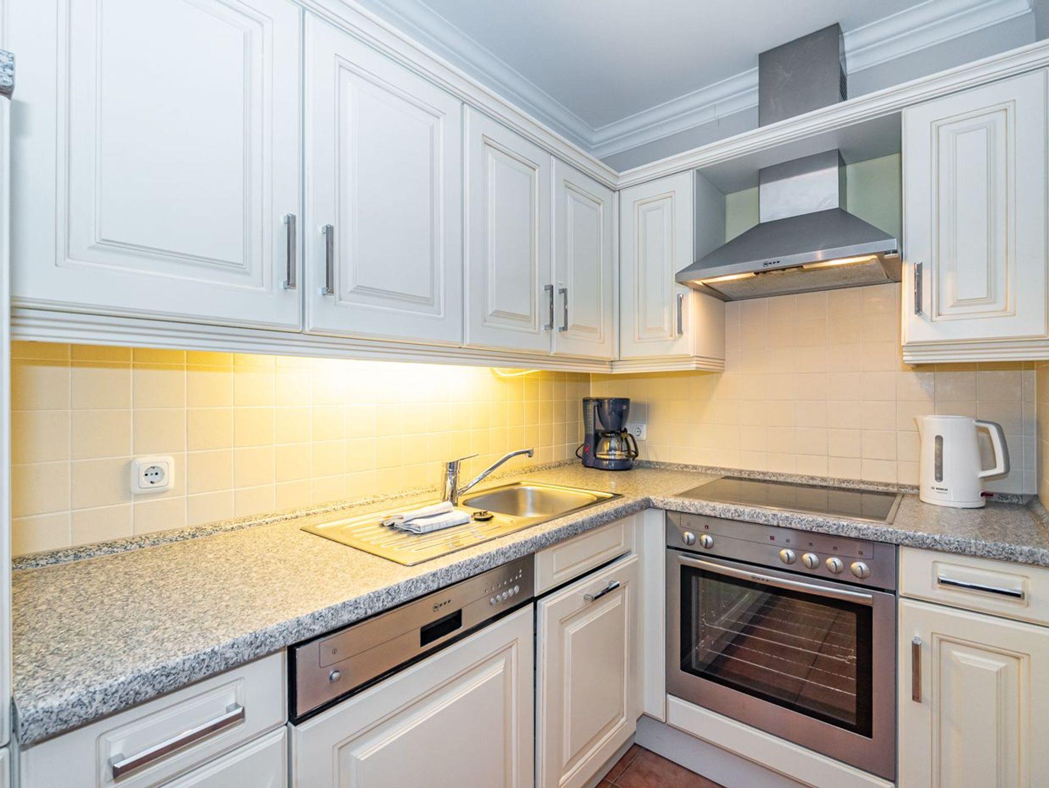 Die offene, vollausgestattete Einbauküche hat einen Geschirrspüler, einen Herd mit Backofen, 4-Platten-Ceranfeld und einen Kühlschrank mit 3-Sterne-Gefrierfach.