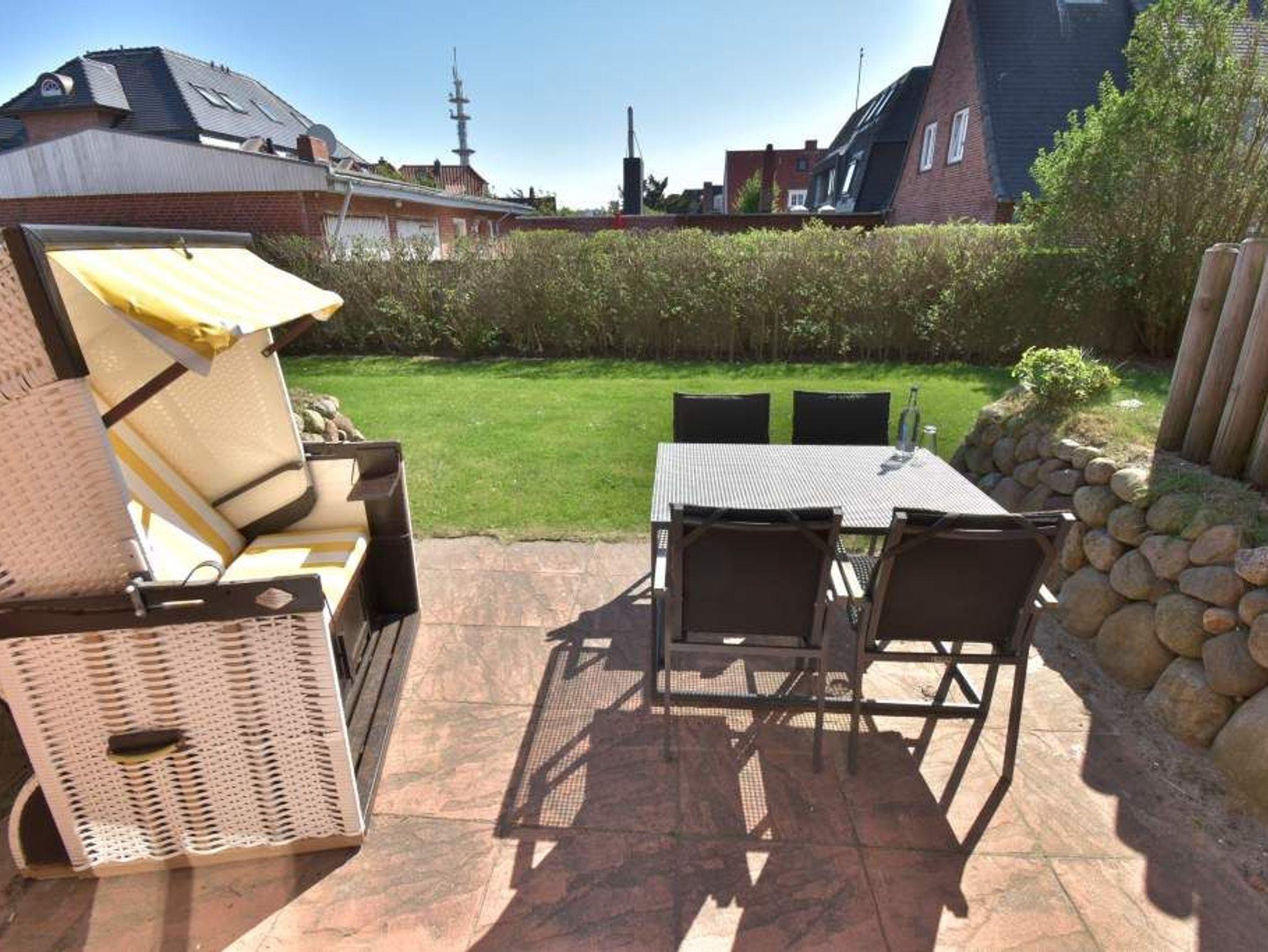 Vom Wohnzimmer betritt man die nach Süden ausgerichtete Sonnenterrasse mit Saison-Strandkorb (ca. April-Oktober) und Gartenmöbeln.
