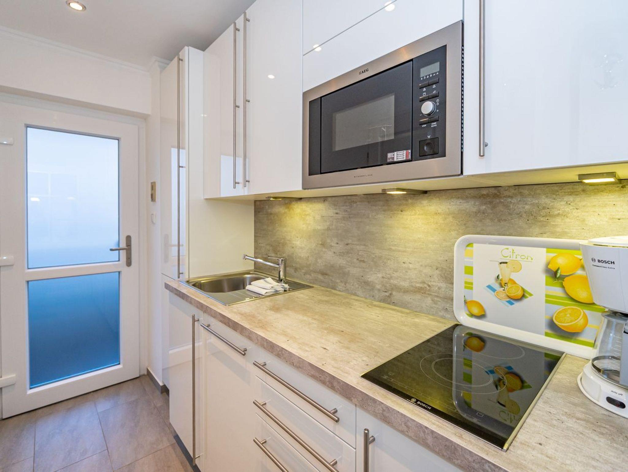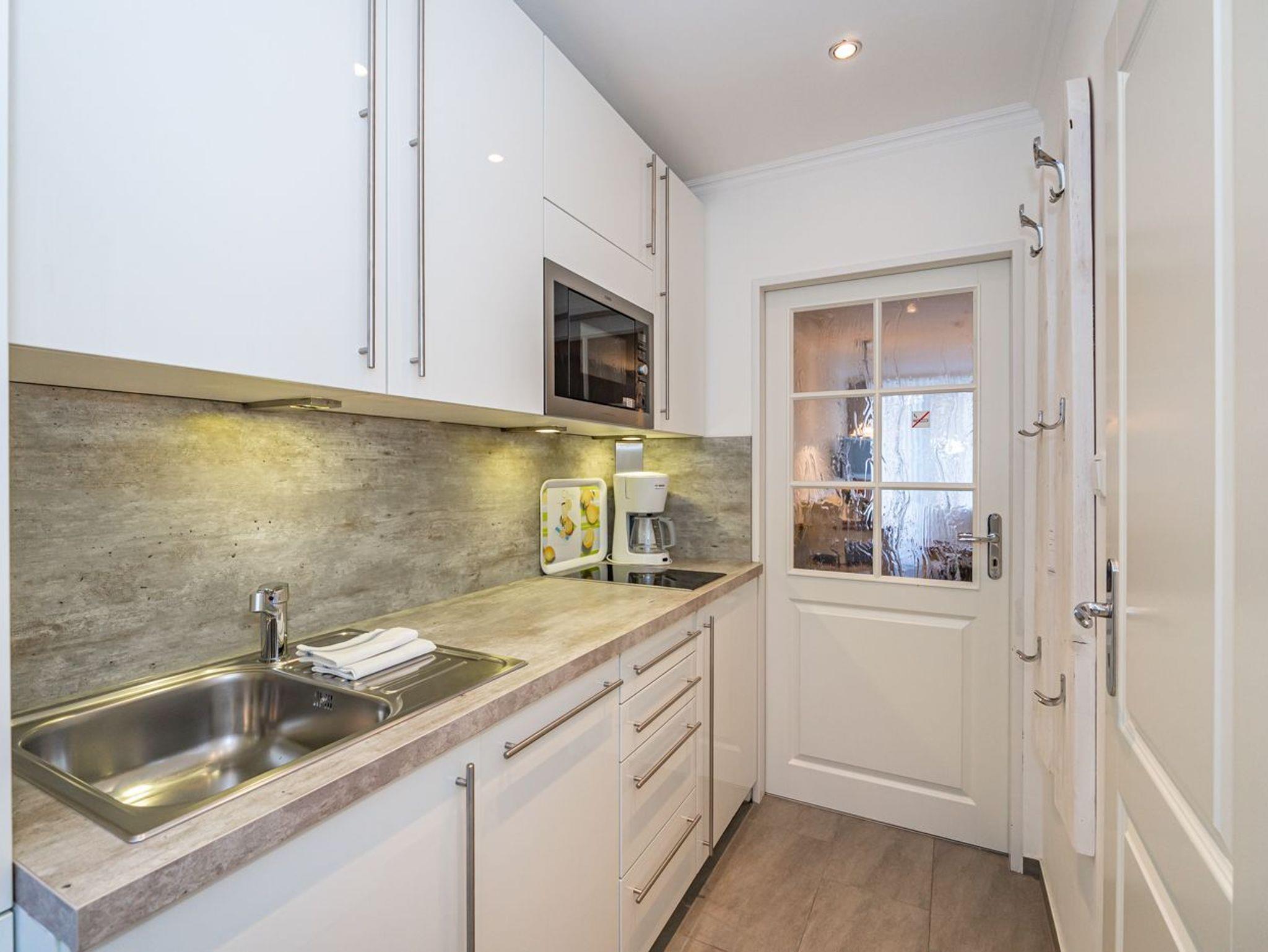 Die moderne Einbauküchenzeile besitzt einen Geschirrspüler, ein 2-Platten-Ceranfeld, eine Mikrowelle und einen Kühlschrank mit 3-Sterne-Gefrierfach. Kaffeemaschine, Wasserkocher und Toaster gehören zur Grundausstattung.