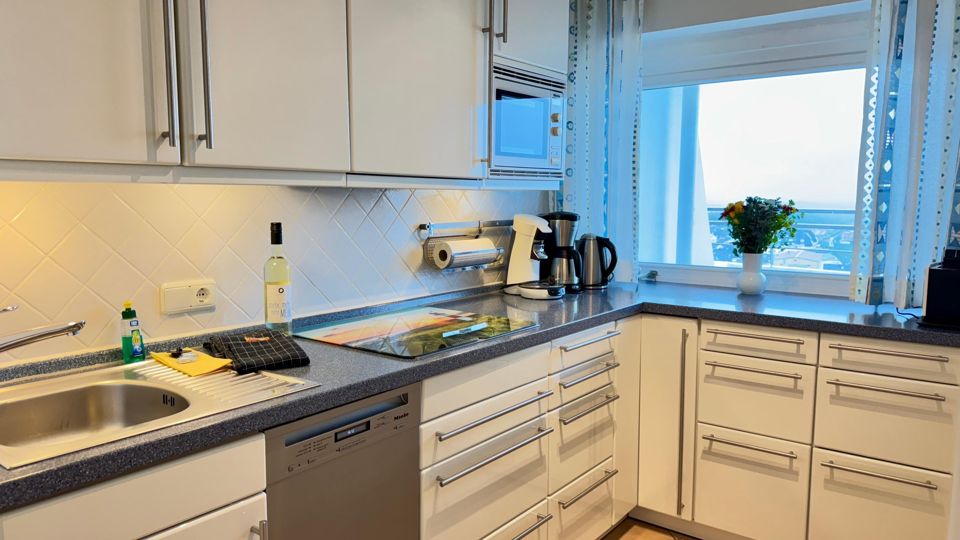 Eine sehr gut ausgestattete Küche mit Cerankochfeld, Mikrowelle, Geschirrspüler, Wasserkocher, Kaffeemaschine und Toaster bietet Ihnen alle Möglichkeiten eines angenehmen Aufenthalts. Das Appartement verfügt über einen W-LAN Internetzugang (ohne Gewähr).