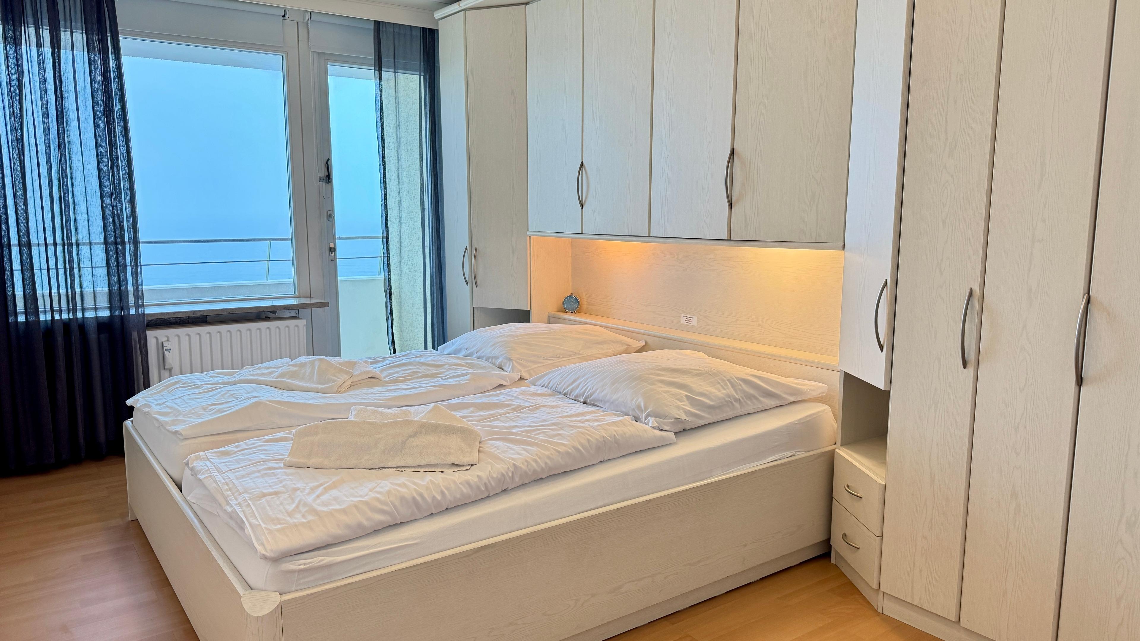 Das Schlafzimmer mit Doppelbett bietet Ihnen in den geräumigen Kleiderschränken genügend Stauraum für Ihr Reisegepäck. Im kleinen Schlafzimmer befindet sich eine Schlafcouch für 2 Personen, ein Flachbildfernseher und ein zusätzlicher Kleiderschrank.
