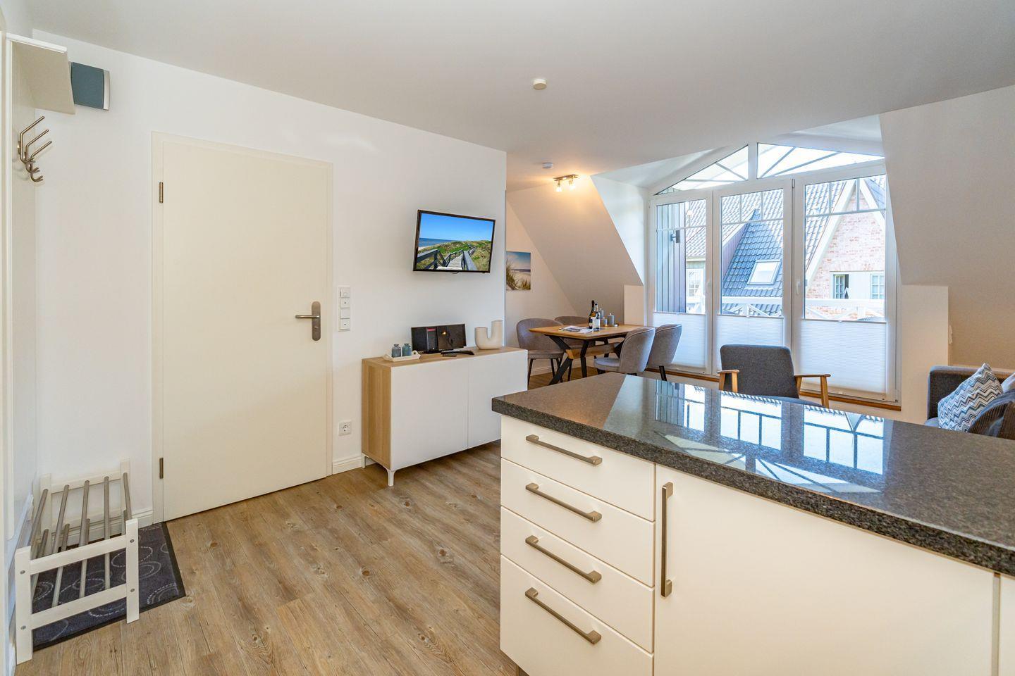 Diese 3-Zimmer-Ferienwohnung (ca. 77 qm) in einem kleinen Ferienhaus mit sechs Wohneinheiten liegt an der Ortsgrenze von Westerland zu Wenningstedt. Ein Bäcker, ein Lebensmittelgeschäft, ein Fahrradverleih und eine Bushaltestelle sind fußläufig sehr gut zu erreichen. Im 1 OG erwartet Sie ein moderner Wohn- / Essbereich mit TV von wo Sie Zugang zum Westbalkon haben, wo Sie auch noch am Nachmittag die Sonne genießen können. Ein Schlafzimmer mit gemütlichen Doppelbett (180 x 200 cm) und ein Badezimmer mit Wanne, Dusche, WC und Waschtrockner befinden sich ebenfalls auf dieser Ebene, genauso wie die moderne, offene Küche. Über eine Treppe gelangen Sie in das Dachgeschoss. Dort befindet sich das zweite Schlafzimmer mit Kojenbett (160 x 200 cm) und das angrenzende, kleine Badezimmer mit WC und Waschtisch. Beide Schlafzimmer verfügen über einen Fernseher. In der Ferienwohnung sind hochwertige, weiße Tischlereinbauten vorhanden für viel Stauraum. Ein Pkw-Stellplatz befindet sich am Haus. Tiere sind in dieser Ferienwohnung nicht erlaubt.