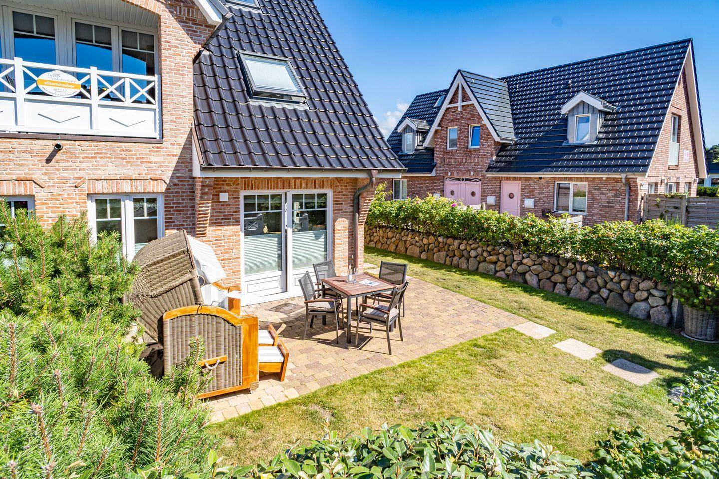 Die Ferienwohnung bietet zwei Schlafzimmer, eine offene Küche und ein behagliches Wohnzimmer mit Zugang zur Terrasse, ideal für entspannte Stunden im Freien. Entspannen Sie im Garten im typisch Sylter Strandkorb.
