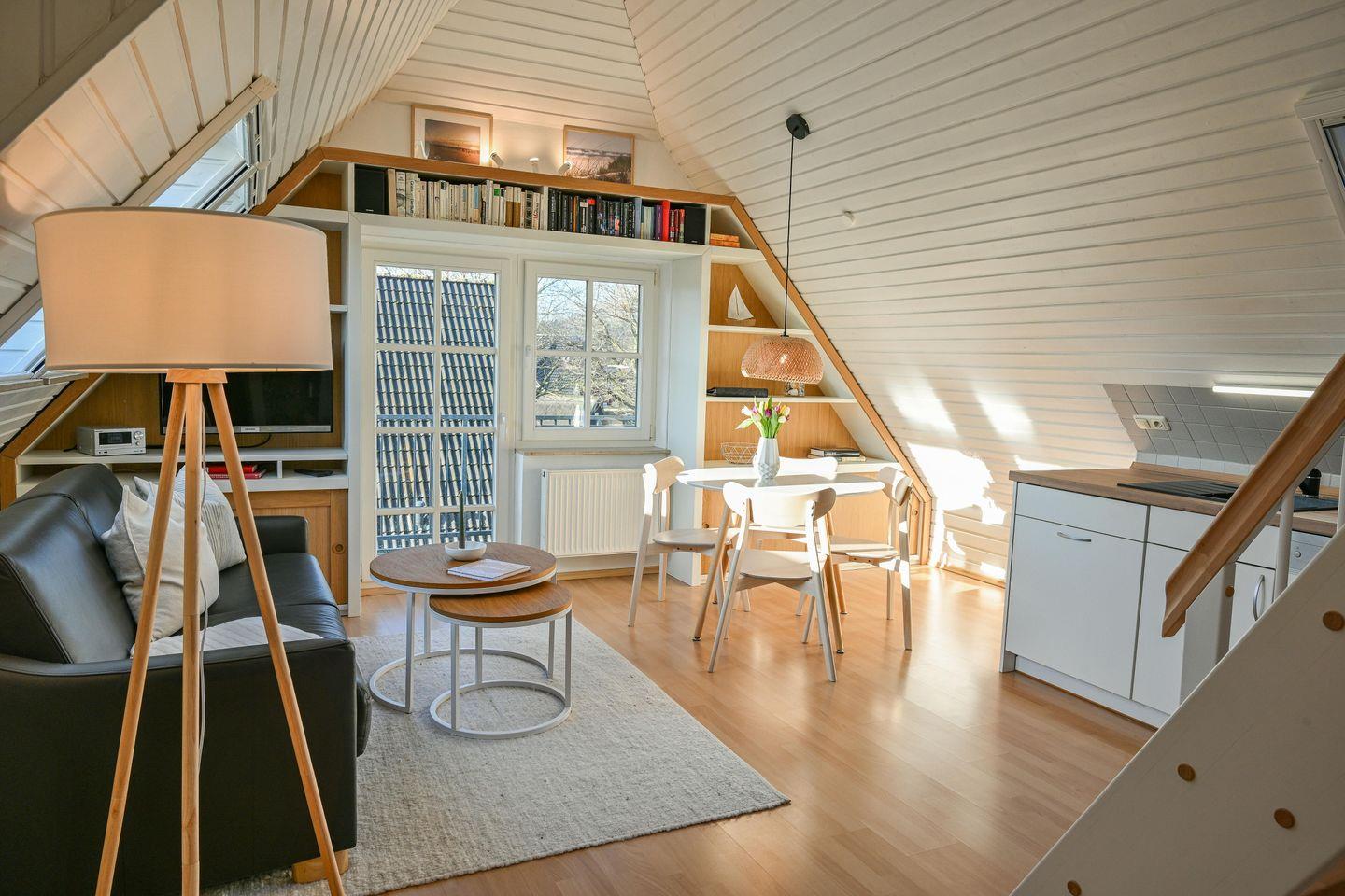 Unsere kleine gemütliche Ferienwohnung unter dem Dach bietet Platz für bis zu 2 Personen. Sie hat einen offenen, hell und freundlich eingerichteten Wohnbereich mit einem Sofa und Flat-TV. Die angrenzende offene Küchenzeile mit Essplatz ist voll ausgestattet.