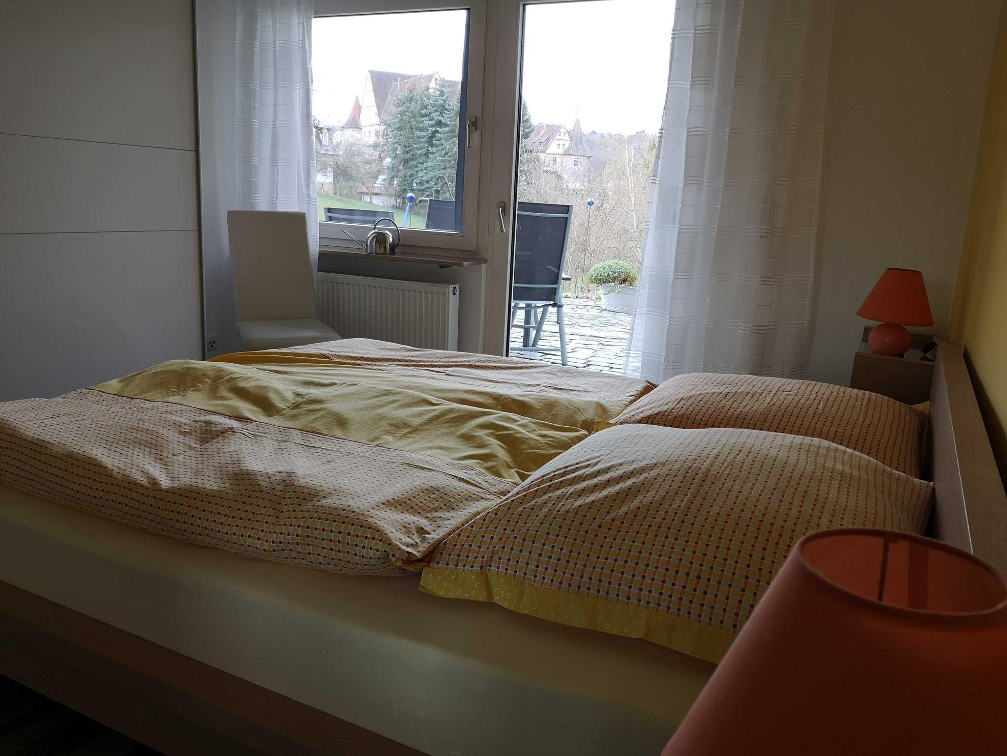 Unsere Ferienwohnung liegt im Untergeschoß des Hauses und verfügt über 3 Zimmer (2 Schlafzimmer, Wohnzimmer), Küche, Duschbad und Abstellraum. Alle Wohnräume haben direkten Zugang zur großen, sonnigen Süd-West-Terrasse. Die Schlafzimmer können verdunkelt werden. Alle Wohnräume verfügen über Fliegengitter an Fenstern oder Türen. Sie haben einen wunderbaren Ausblick auf Schloss Wiesenthau. In Schlafzimmer 1 - blau - steht Ihnen ein Bett 1,80 x 2 Meter, In Schlafzimmer 2 - gelb -ein Bett mit 1,60 x 2 Meter zur Verfügung. Kleinkinderausstattung (Bett und Hochstuhl) auf Anfrage. Die Wohnung kann maximal 4 Erwachsene und ein Kleinkind beherbergen.
