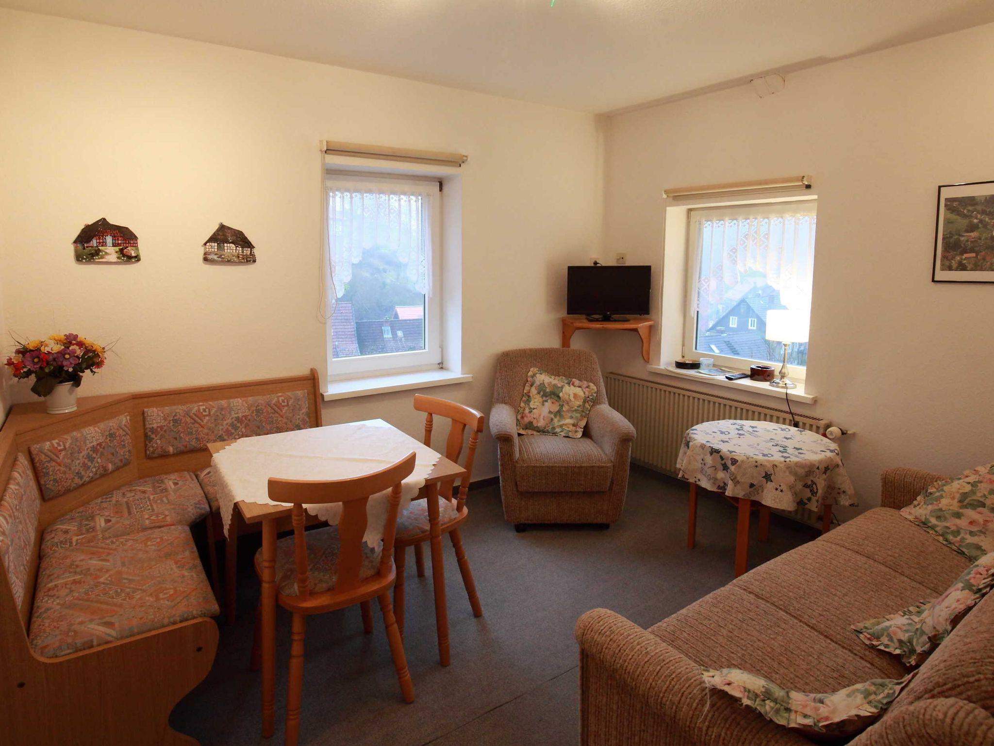 Die Ferienwohnung 1 im Haus Brandt in Wildemann im Oberharz hat 50qm Wohnfläche, ist für bis zu 4 Personen geeignet und verfügt über einen separaten Eingang.