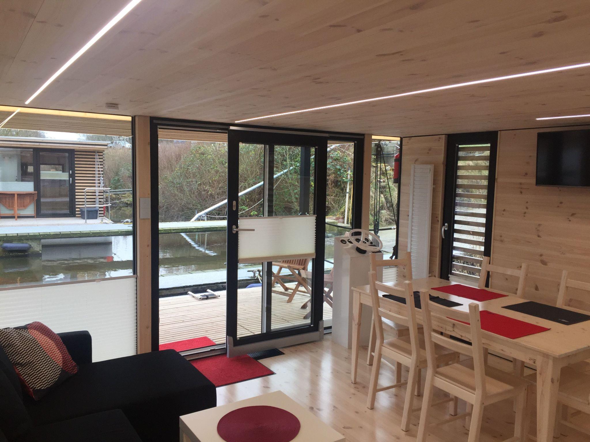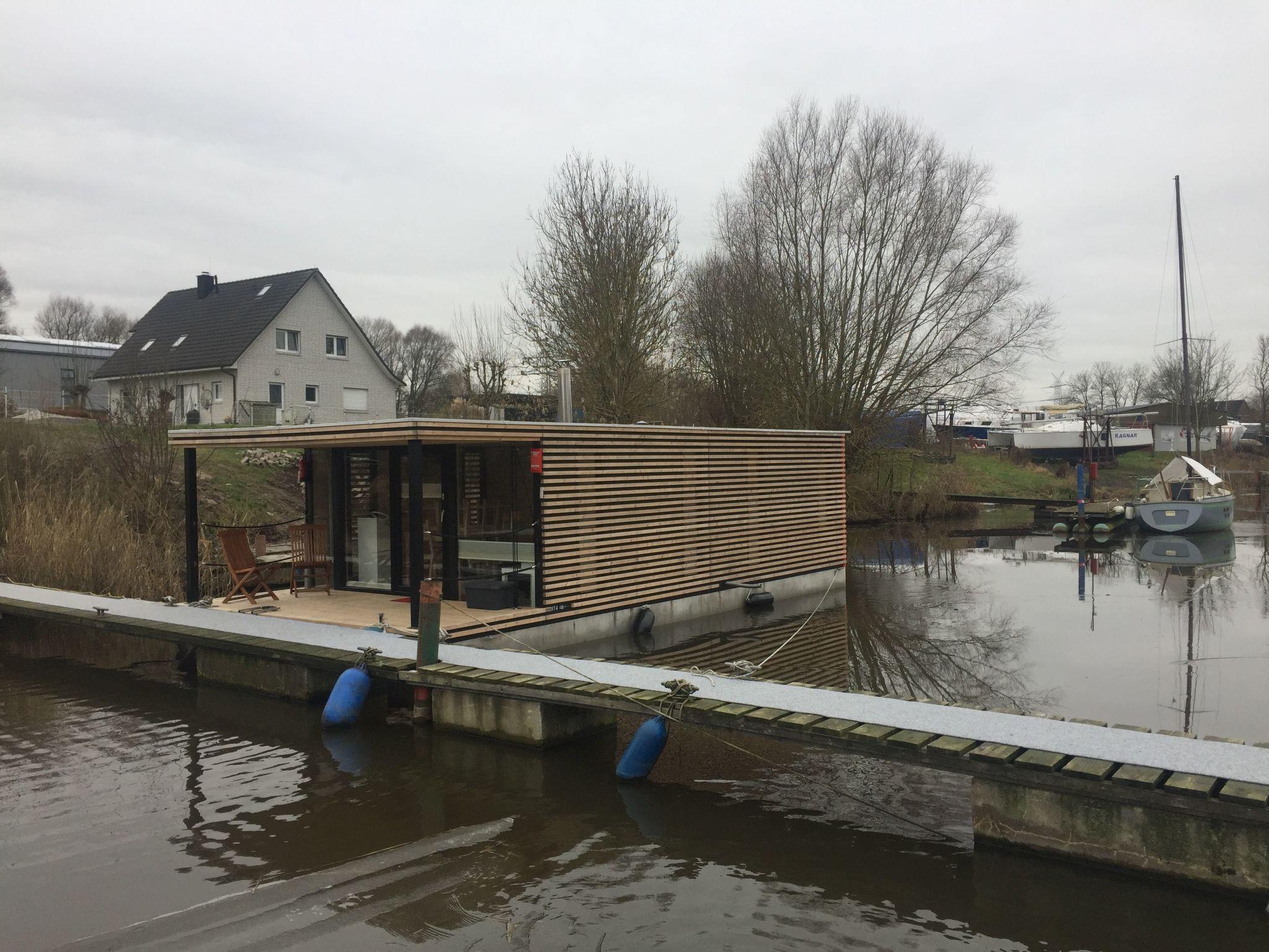 Das Hausboot HT 4 ist ein stationäres, schwimmendes Haus mit Blick auf den Fluss Maade.