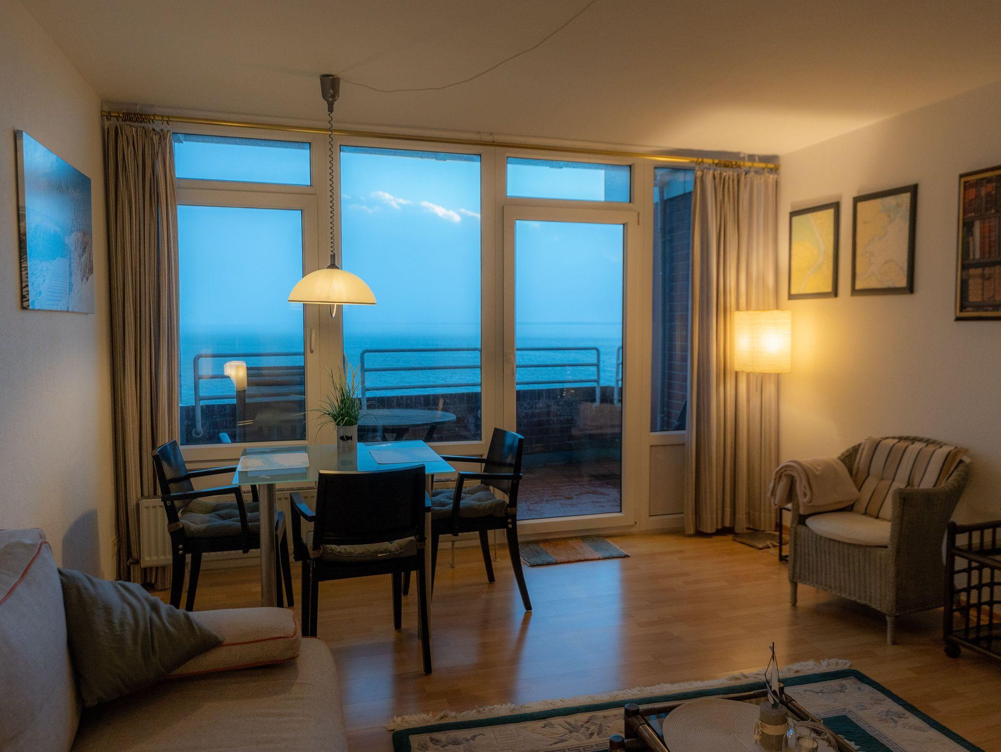 Im Schlafzimmer befindet sich ein Doppelbett mit großem Kleiderschrank. Das Wohnzimmer ist mit einer Schlafcouch ausgestattet und lässt sich bei Bedarf in ein weiteres Bett für eine weitere Person verwandeln. Ein Esstisch mit Stühlen ist direkt am großen Fenster untergebracht. Genießen Sie den weiten Blick aufs Meer. Über den modernen Flachbildschirm können Sie fernsehen. WLAN ist selbstverständlich vorhanden.
