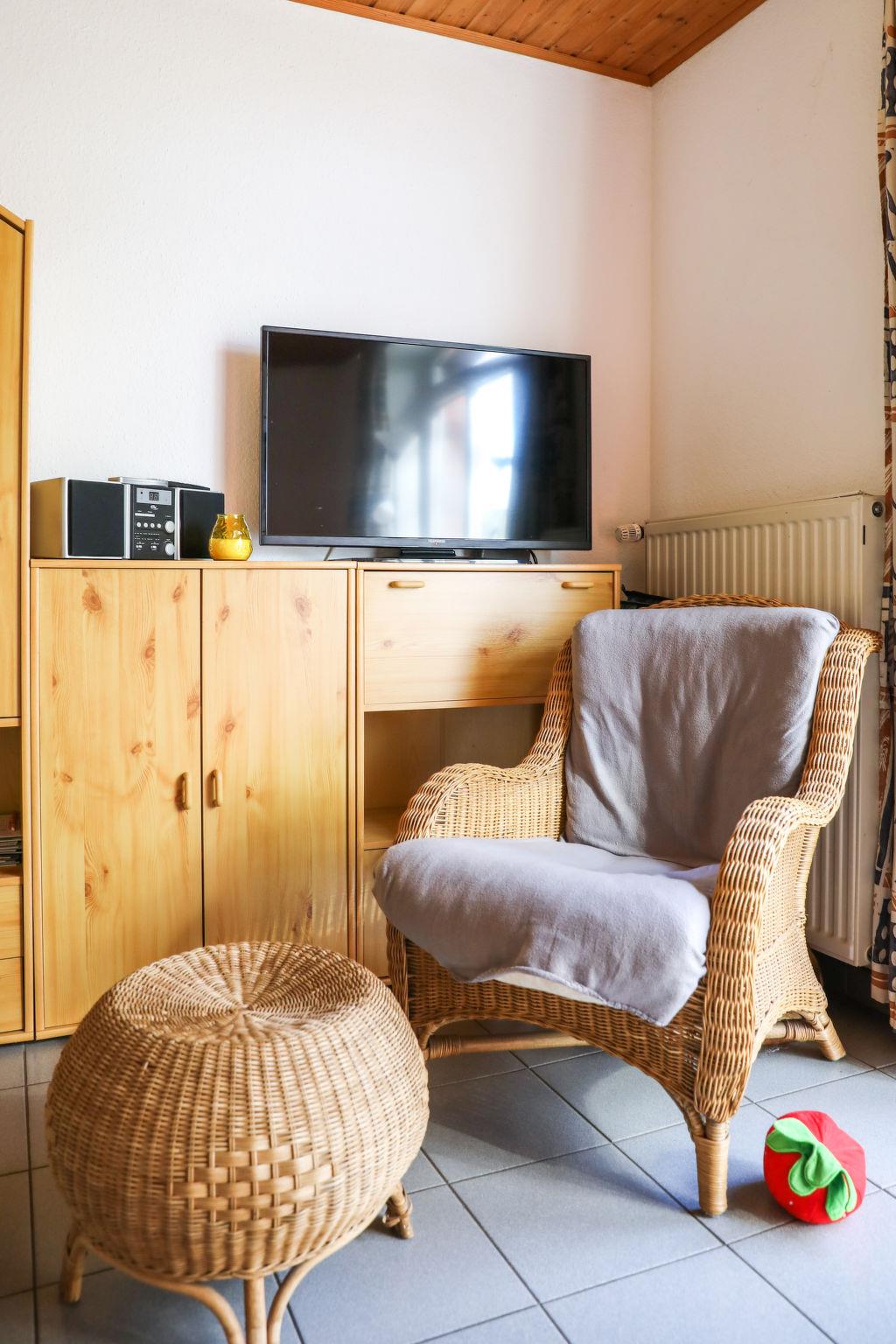 2-Zimmer-Wohnung 55 m2, im Erdgeschoss. Gemütlich eingerichtet: Wohn-/Esszimmer mit Sat-TV, Stereoanlage und DVD. Ausgang zur Terrasse. 1 Zimmer mit 1 Doppelbett (160 cm, Länge 200 cm). Kochnische (Backofen, 4 Glaskeramikplatten, Toaster, Wasserkocher, elektrische Kaffeemaschine). Dusche/WC. Ölheizung. Terrasse. Terrassenmöbel, Gartengrill. Zur Verfügung: Kinderhochstuhl, Babybett. Internet (WLAN, gratis). Bitte beachten: Maximal 3 Haustiere/Hunde erlaubt. Rauchmelder, Feuerlöscher.
