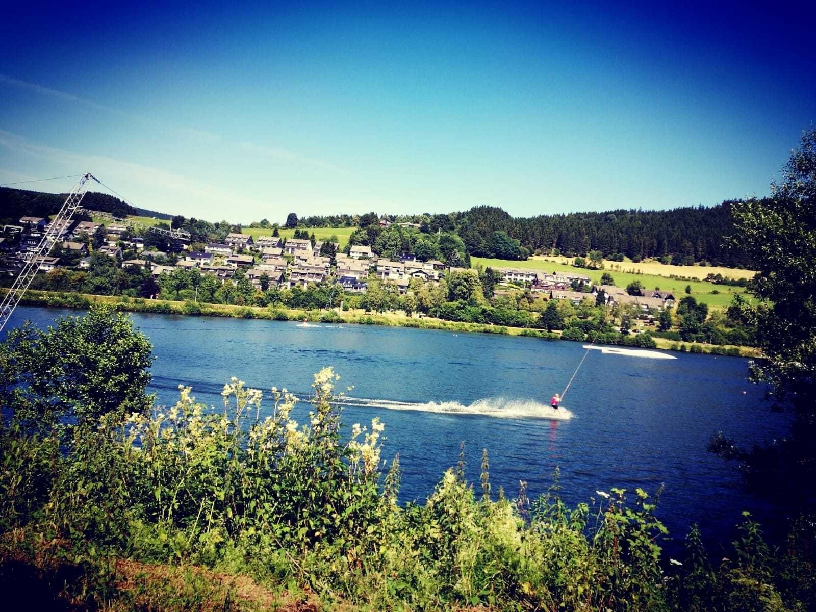 Wassersport am Hillebachsee (Stausee): Wake Boarden, Wasserski, Tretboot, Baden, Schwimmen,