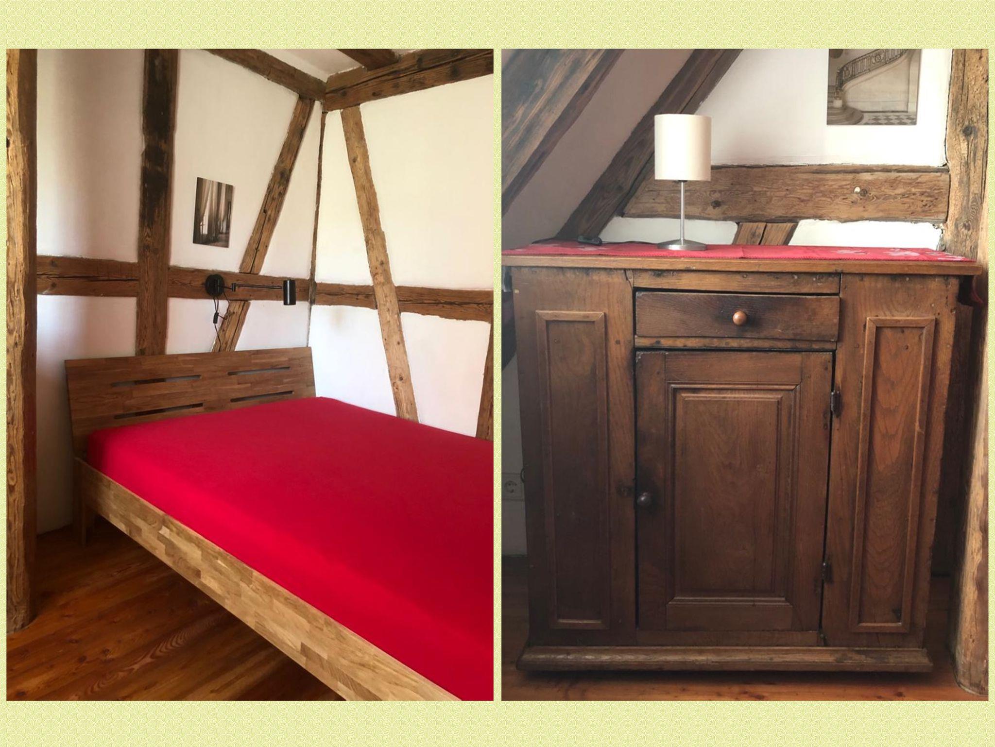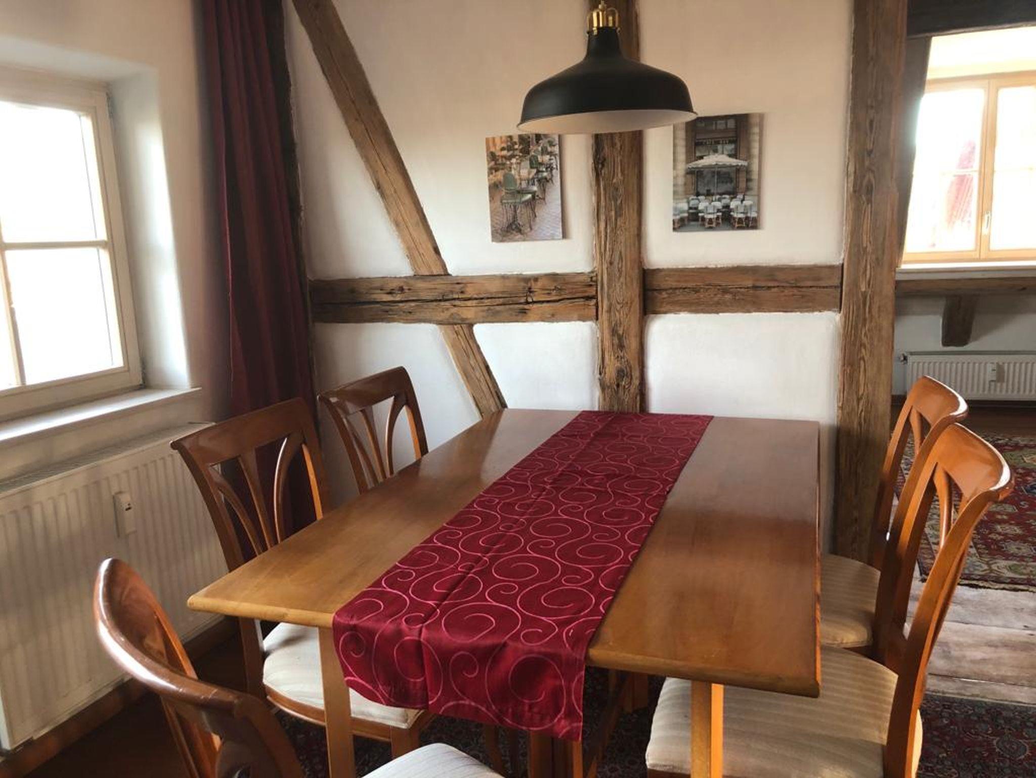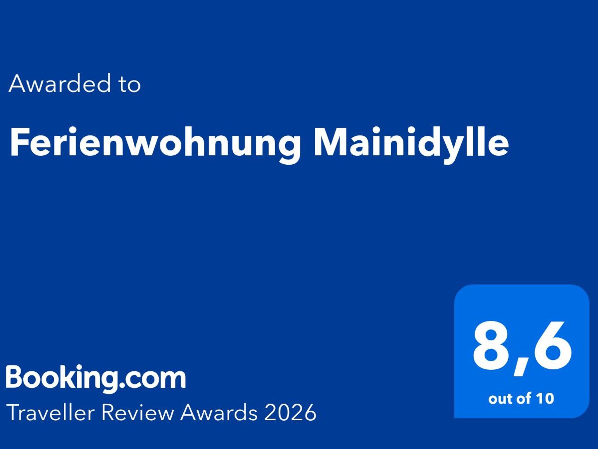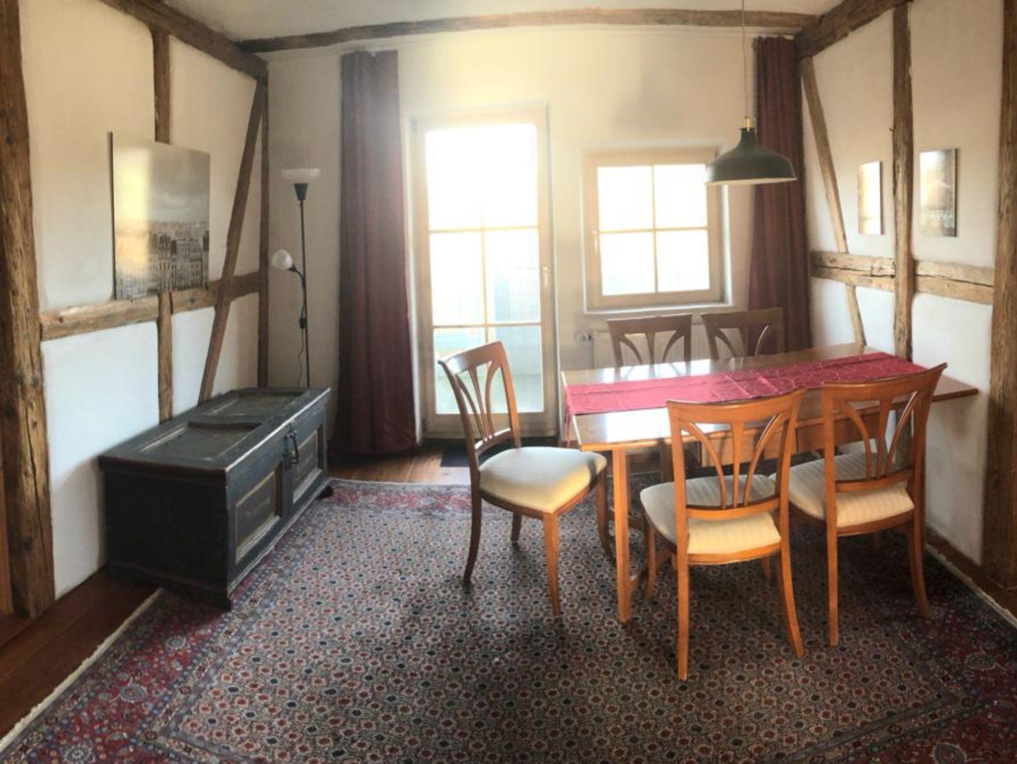 Ferienwohnung MAINIDYLLE: Wohnung im 2. OG (kein Fahrstuhl) mit Küche/Esszimmer, 2 Schlafzimmer, Wohnzimmer, Badezimmer mit Badewanne/Dusche. Balkon. Stilvoll und hochwertig eingerichtet. Offenes Fachwerk, Holzböden. Freies WLAN. Parkplatz. Gartensitzplatz mit Grill. Für max. 6 Personen + Kleinkind. Weitere Personen auf Anfrage (Matratze).