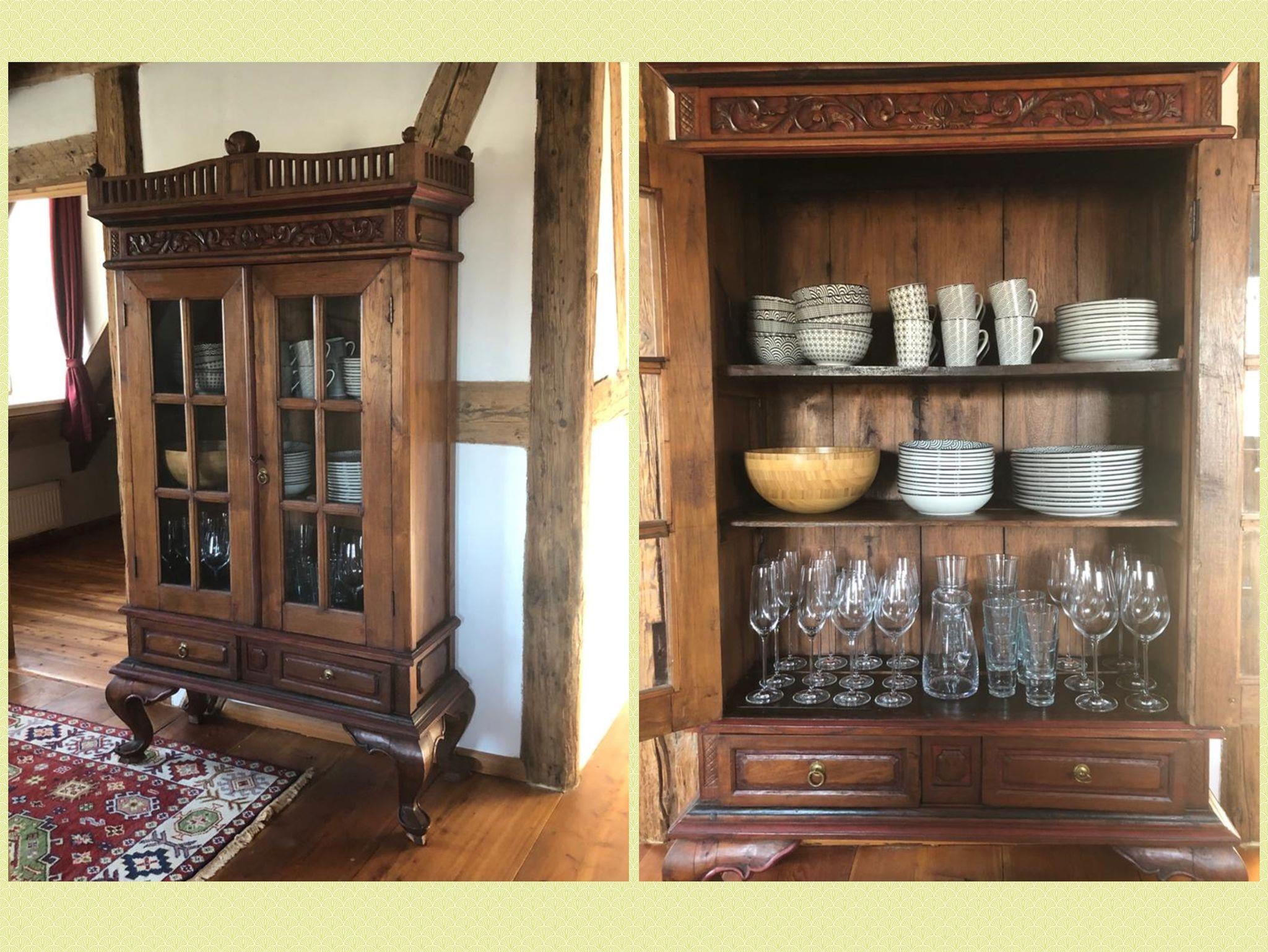 Esstisch für 6 Personen. Umfassend und hochwertig ausgestattete Einbauküche mit Herd, Backofen, Kühlschrank mit Kühlfach, Kaffeemaschine, Toaster, Wasserkocher, Rührgerät, Stabmixer, Waage etc. (keine Geschirrspülmaschine), Geschirrtücher. Babyhochstuhl. Garderobe, Schuhregal und Spiegel.