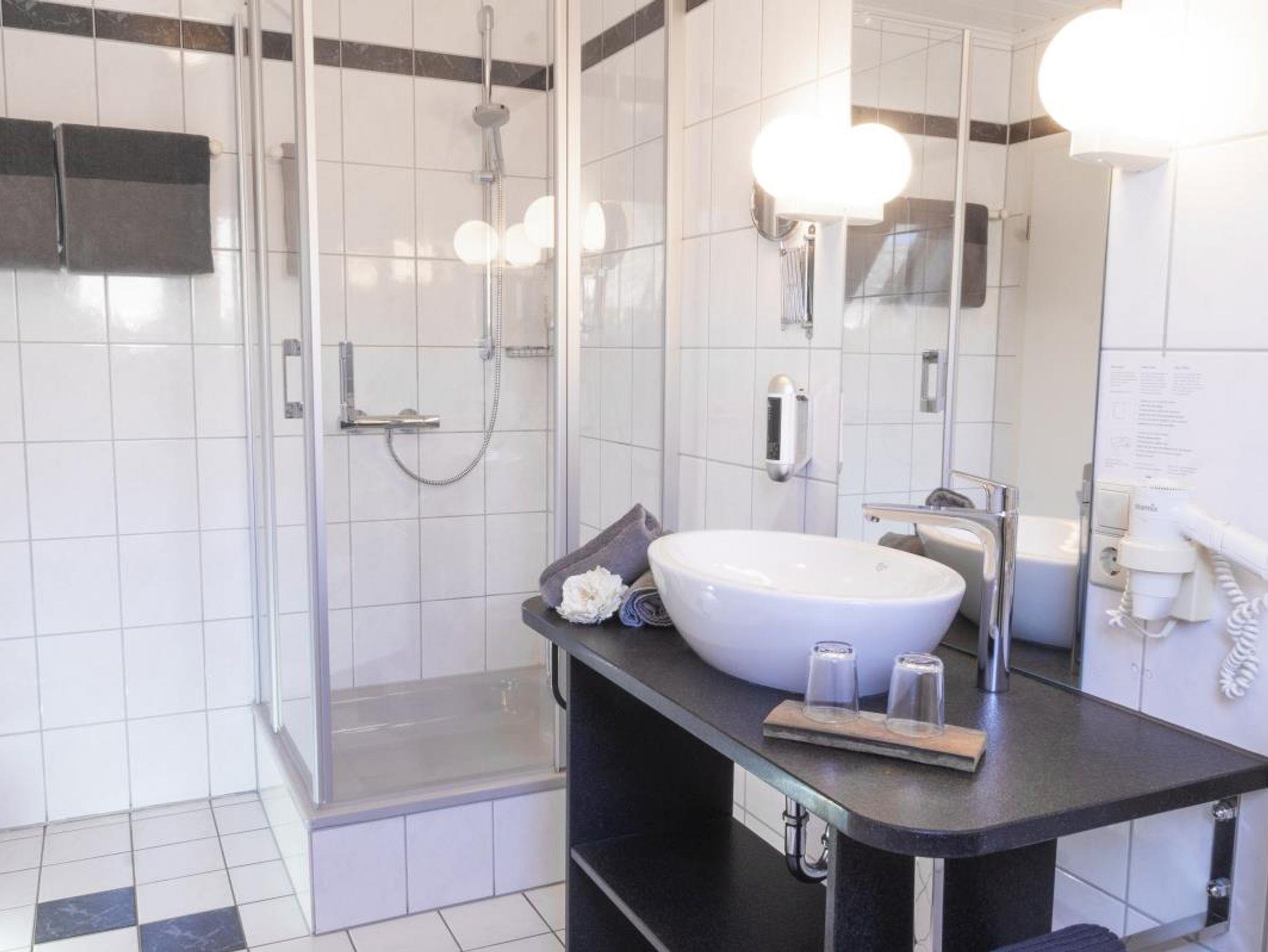 Zu jedem Zimmer gehören DU/WC, Haarfön, Seife, Kosmetikspiegel, Sat-TV, Radiowecker und Wasserkocher.