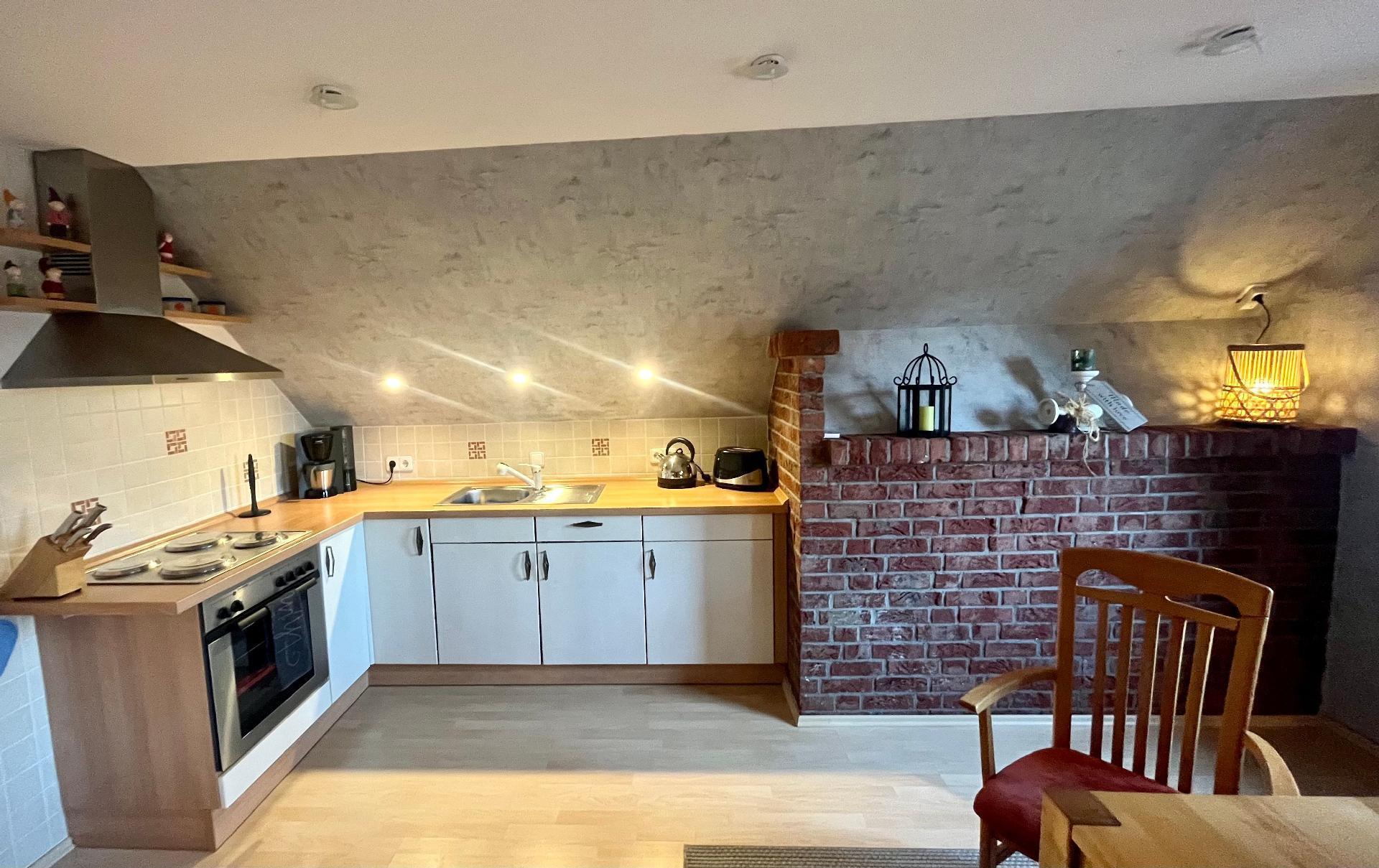 Wohnen auf ostfriesisch: Mit dem für diese Gegend typischen Ostfriesensofa wird die Wohnküche zum Aufenthaltsort für schöne Stunden daheim. Für die ganz Kleinen halten wir einen Hochstuhl bereit!