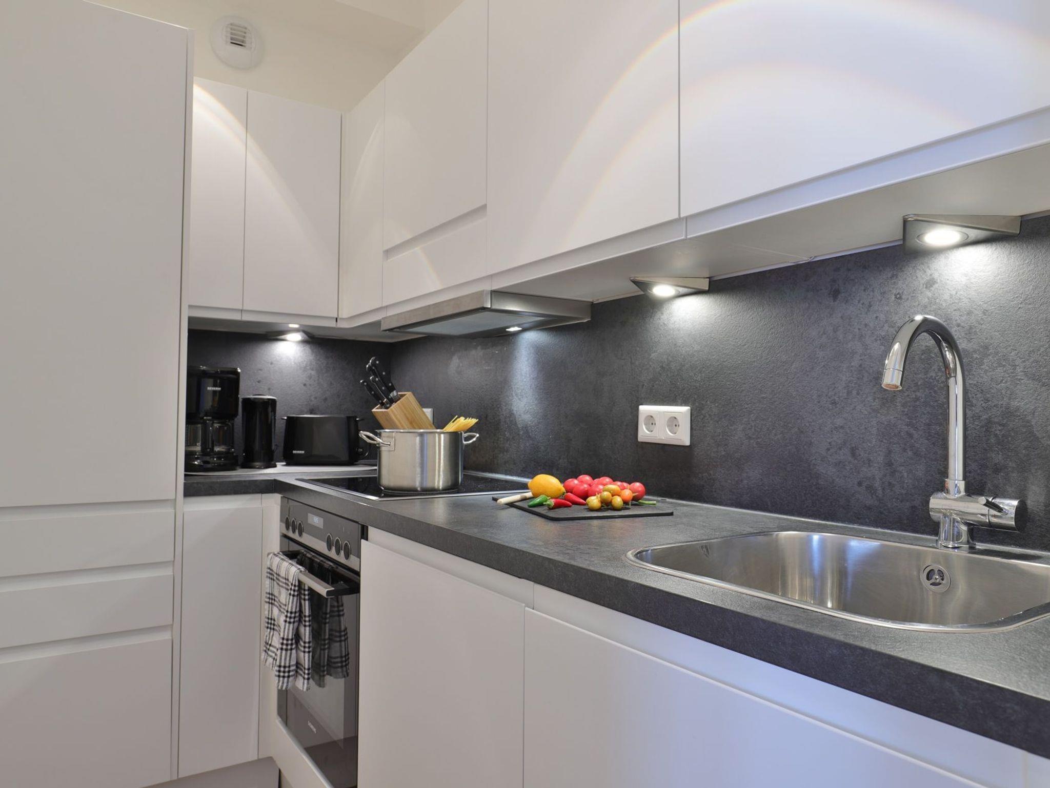 Appartementhaus mit 48 Appartements. Dieses exklusive 64 m² große 3-Zimmer-Appartement bietet ausreichend Platz für 4 Personen. Hier residieren Sie in der fünften Etage, die leicht durch den Lift zu erreichen ist. Der modern eingerichtete Wohn-/Essbereich ist mit einem Sofa, einer Essecke und einem Fernseher ausgestattet. Von hier aus haben Sie Zugang zum Balkon mit einem atemberaubenden Blick. Die voll ausgestattete (Glaskeramik-Kochfeld, Backofen, Kühlschrank mit Gefrierteil), separate Küche lässt keine Wünsche offen. 2 stilvoll eingerichtete Schlafzimmer mit Doppelbett und jeweils einem weiteren TV-Gerät und ein Duschbad stehen Ihnen während Ihres Urlaubes zur Verfügung. Haustiere sind in diesem eleganten Appartement herzlich willkommen. In unmittelbarer Nähe sind öffentliche Parkplätze vorhanden.