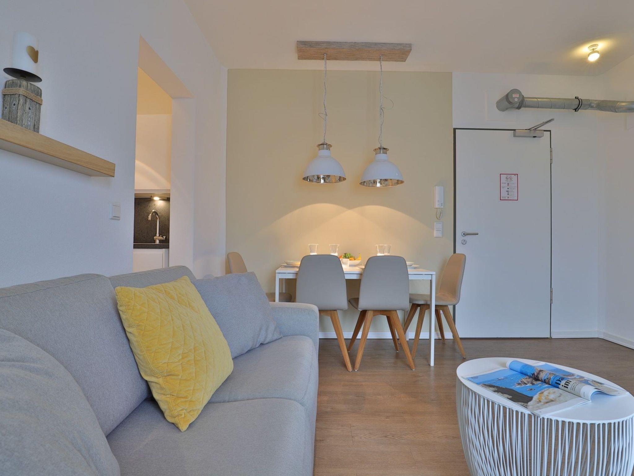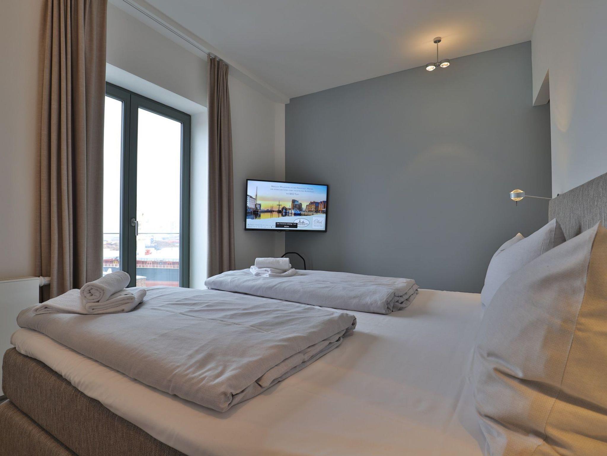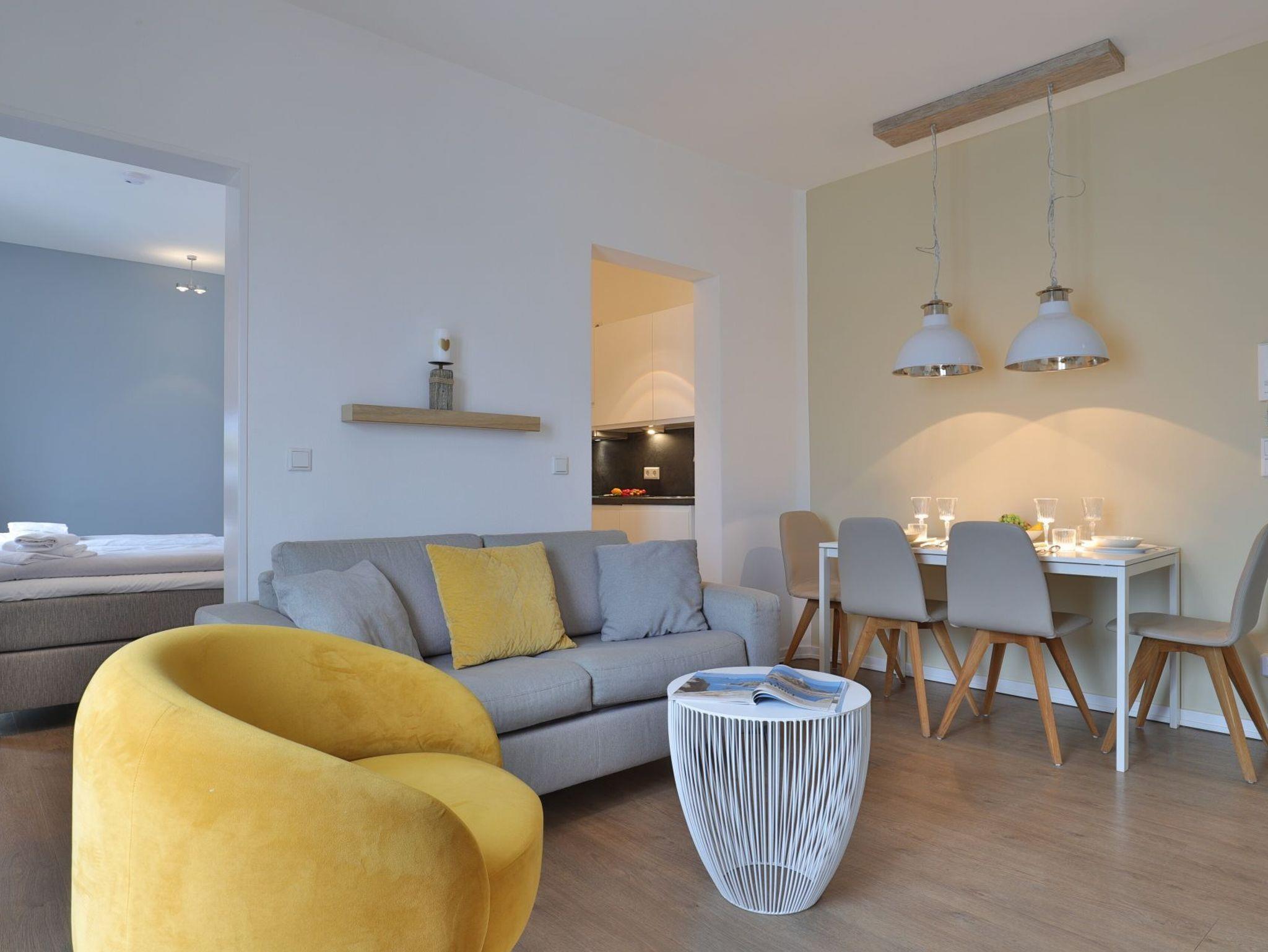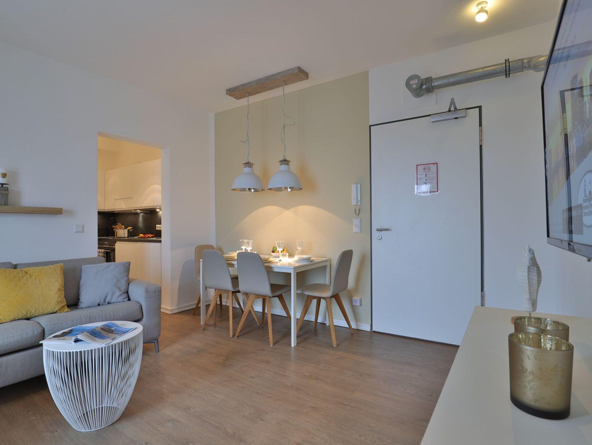 Dieses exklusive 64 m² große 3-Zimmer-Appartement bietet ausreichend Platz für 4 Personen. Hier residieren Sie in der fünften Etage, die leicht durch den Lift zu erreichen ist. Der modern eingerichtete Wohn-/Essbereich ist mit einem Sofa, einer Essecke und einem Fernseher ausgestattet. Von hier aus haben Sie Zugang zum Balkon mit einem atemberaubenden Blick. Die voll ausgestattete (Glaskeramik-Kochfeld, Backofen, Kühlschrank mit Gefrierteil), separate Küche lässt keine Wünsche offen. 2 stilvoll eingerichtete Schlafzimmer mit Doppelbett und jeweils einem weiteren TV-Gerät und ein Duschbad stehen Ihnen während Ihres Urlaubes zur Verfügung. Haustiere sind in diesem eleganten Appartement herzlich willkommen. In unmittelbarer Nähe sind öffentliche Parkplätze vorhanden.