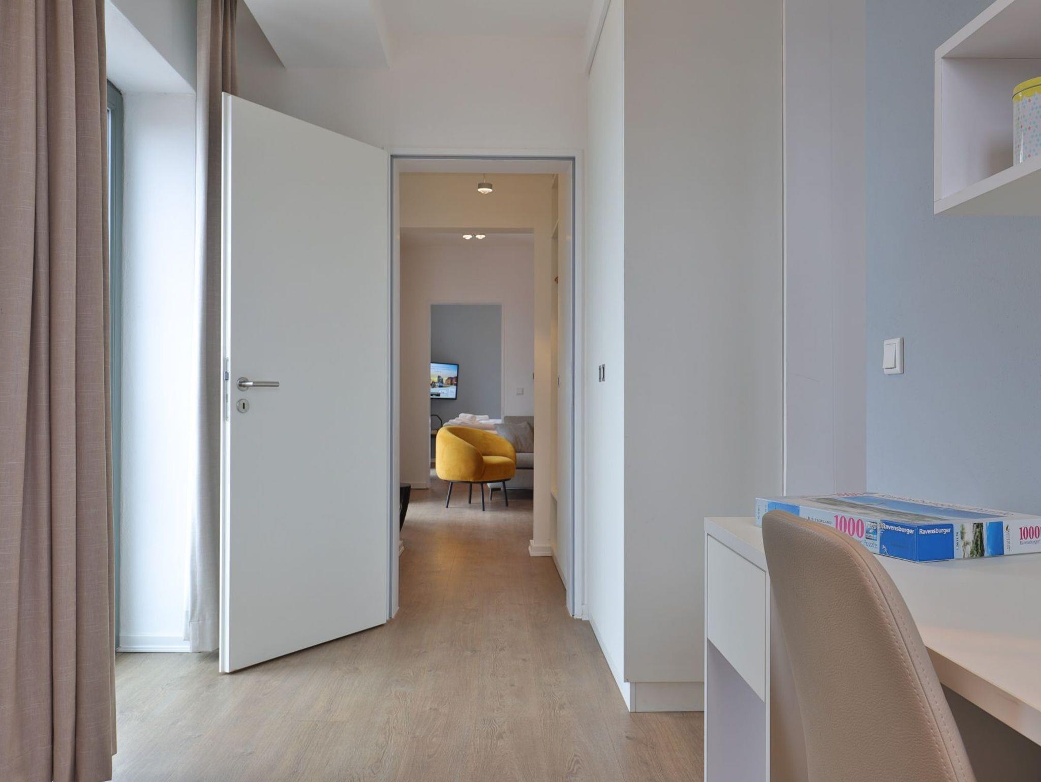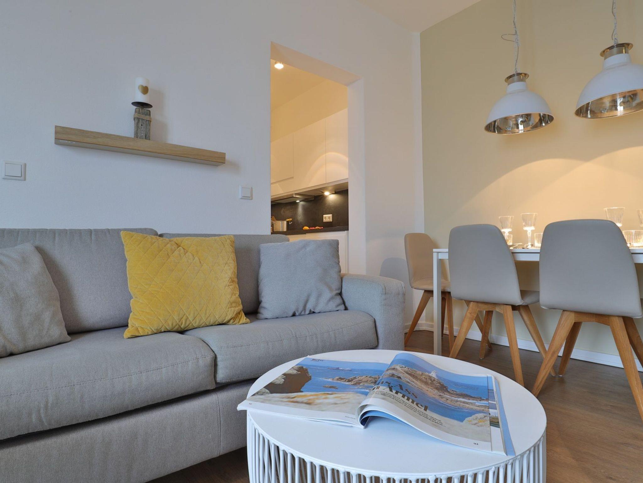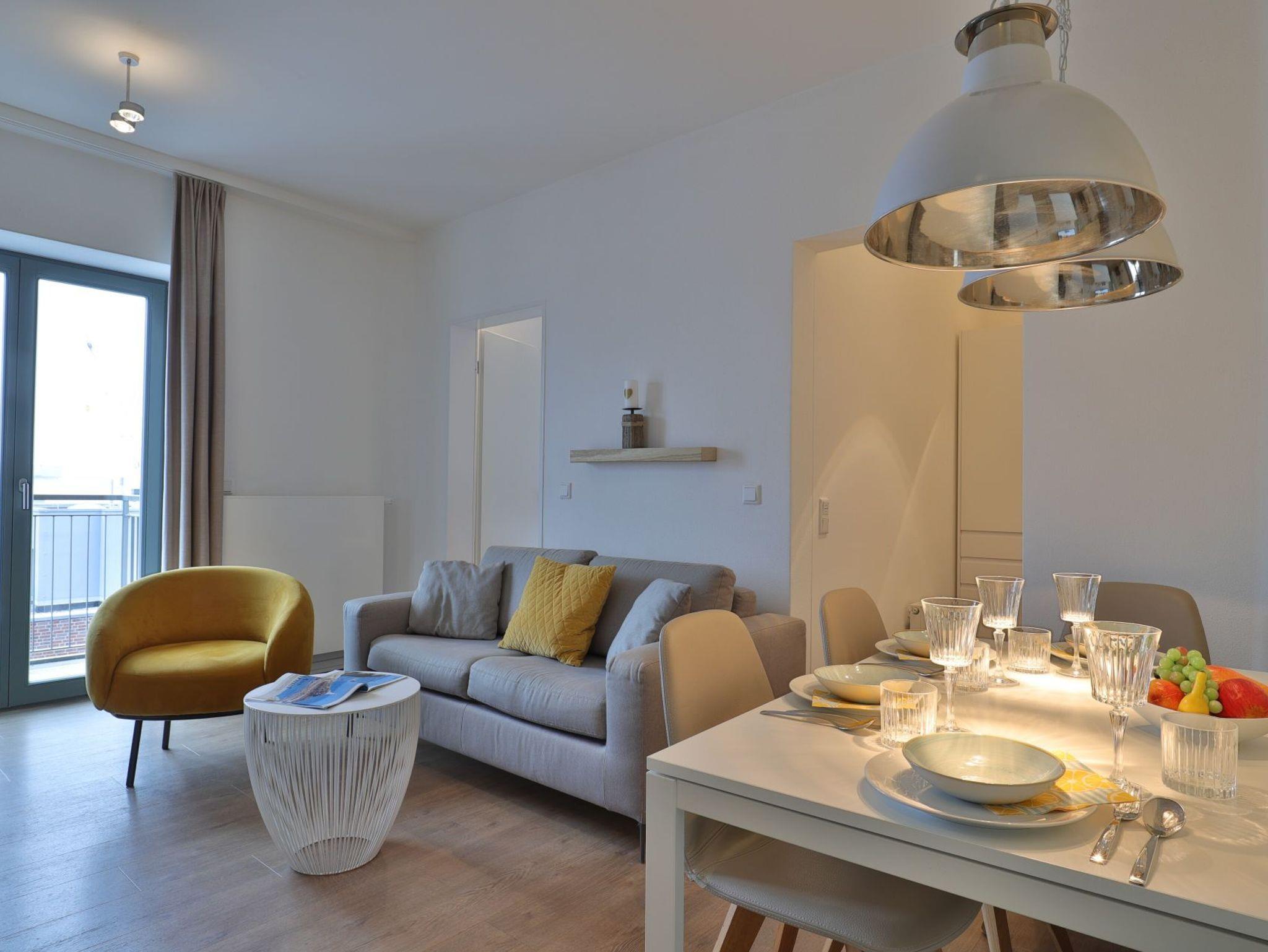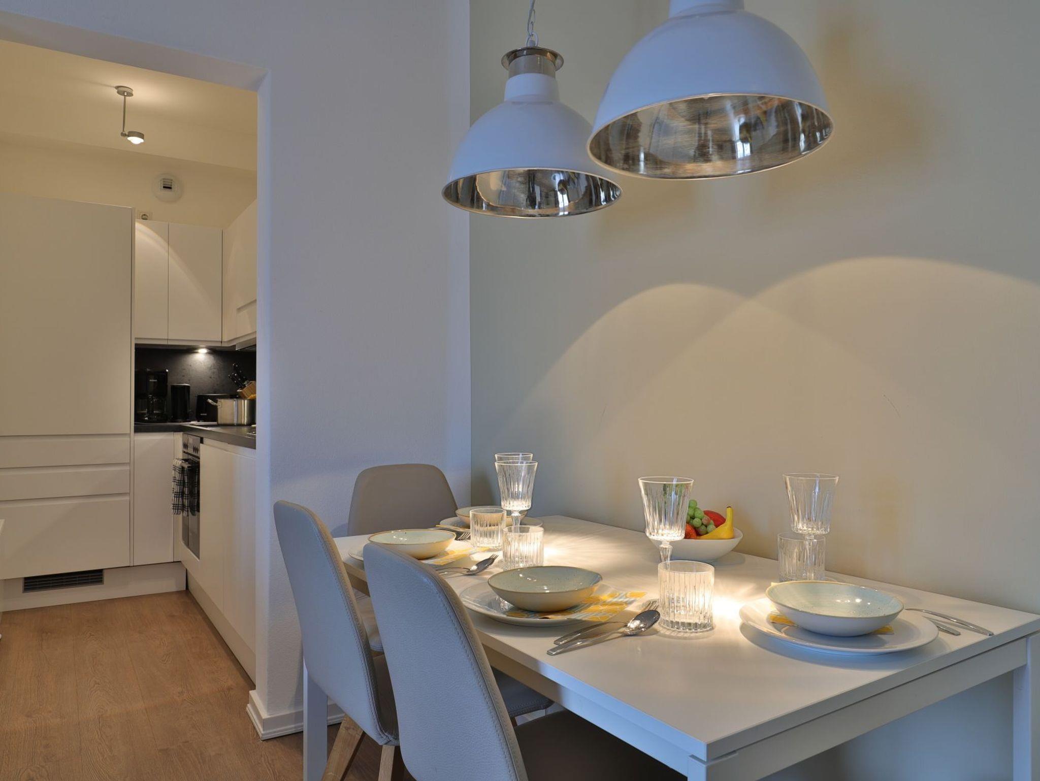 Dieses exklusive 64 m² große 3-Zimmer-Appartement bietet ausreichend Platz für 4 Personen. Hier residieren Sie in der fünften Etage, die leicht durch den Lift zu erreichen ist. Der modern eingerichtete Wohn-/Essbereich ist mit einem Sofa, einer Essecke und einem Fernseher ausgestattet. Von hier aus haben Sie Zugang zum Balkon mit einem atemberaubenden Blick. Die voll ausgestattete (Glaskeramik-Kochfeld, Backofen, Kühlschrank mit Gefrierteil), separate Küche lässt keine Wünsche offen. 2 stilvoll eingerichtete Schlafzimmer mit Doppelbett und jeweils einem weiteren TV-Gerät und ein Duschbad stehen Ihnen während Ihres Urlaubes zur Verfügung. Haustiere sind in diesem eleganten Appartement herzlich willkommen. In unmittelbarer Nähe sind öffentliche Parkplätze vorhanden.