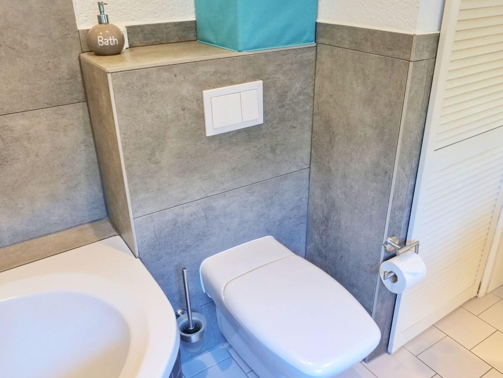 - Badezimmer mit Dreieckswanne, WC, Waschmaschine