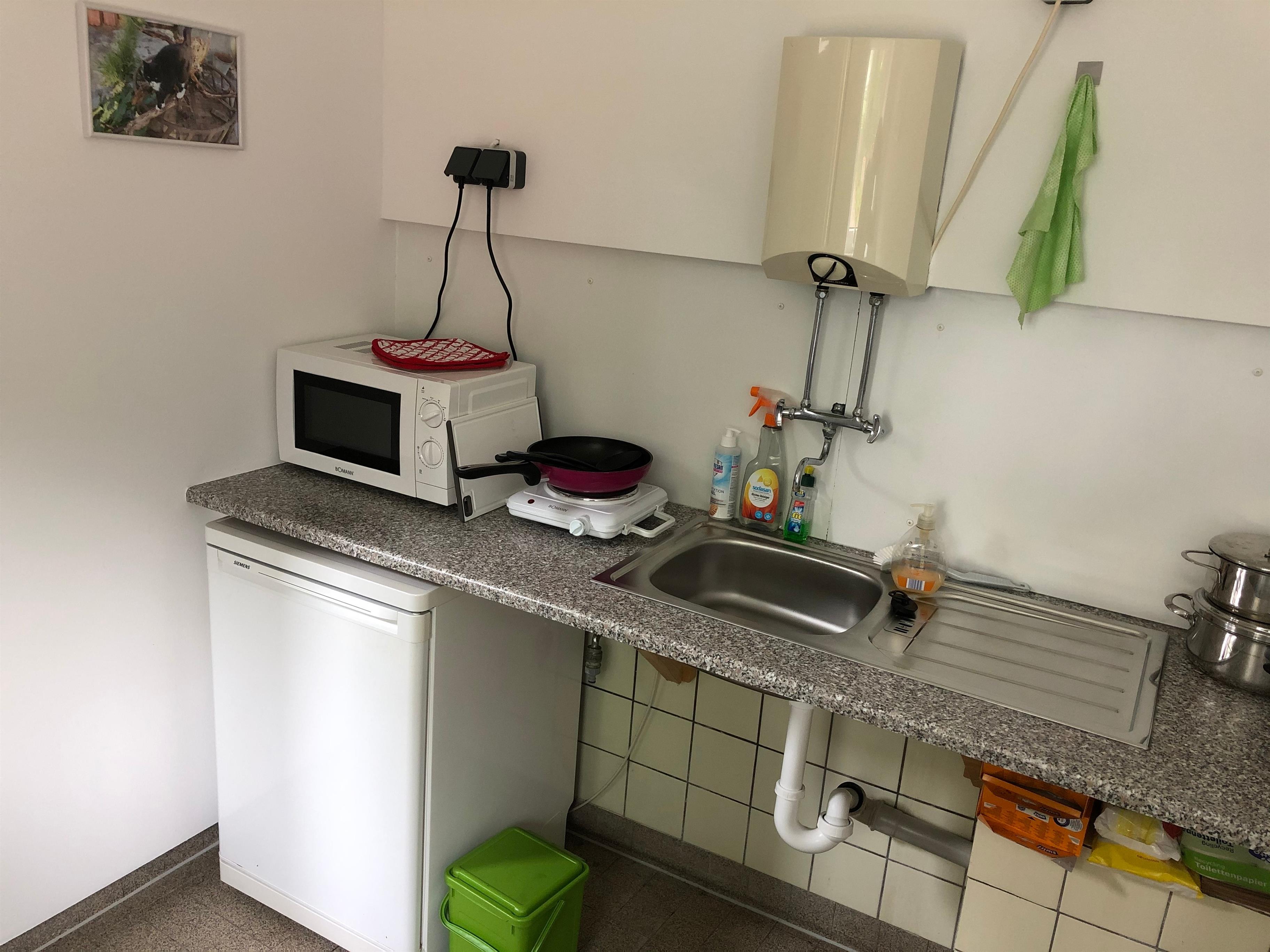 Die Vordiele darf gerne mit genutzt werden. Von dort aus zugänglich gibt es eine Gemeinschaftsküche, die man sich mit Gästen aus dem Tinyhouse-Bauwagen teilt. Dort steht ein Kühlschrank, Mikrowelle, eine Kochplatte und Spüle.