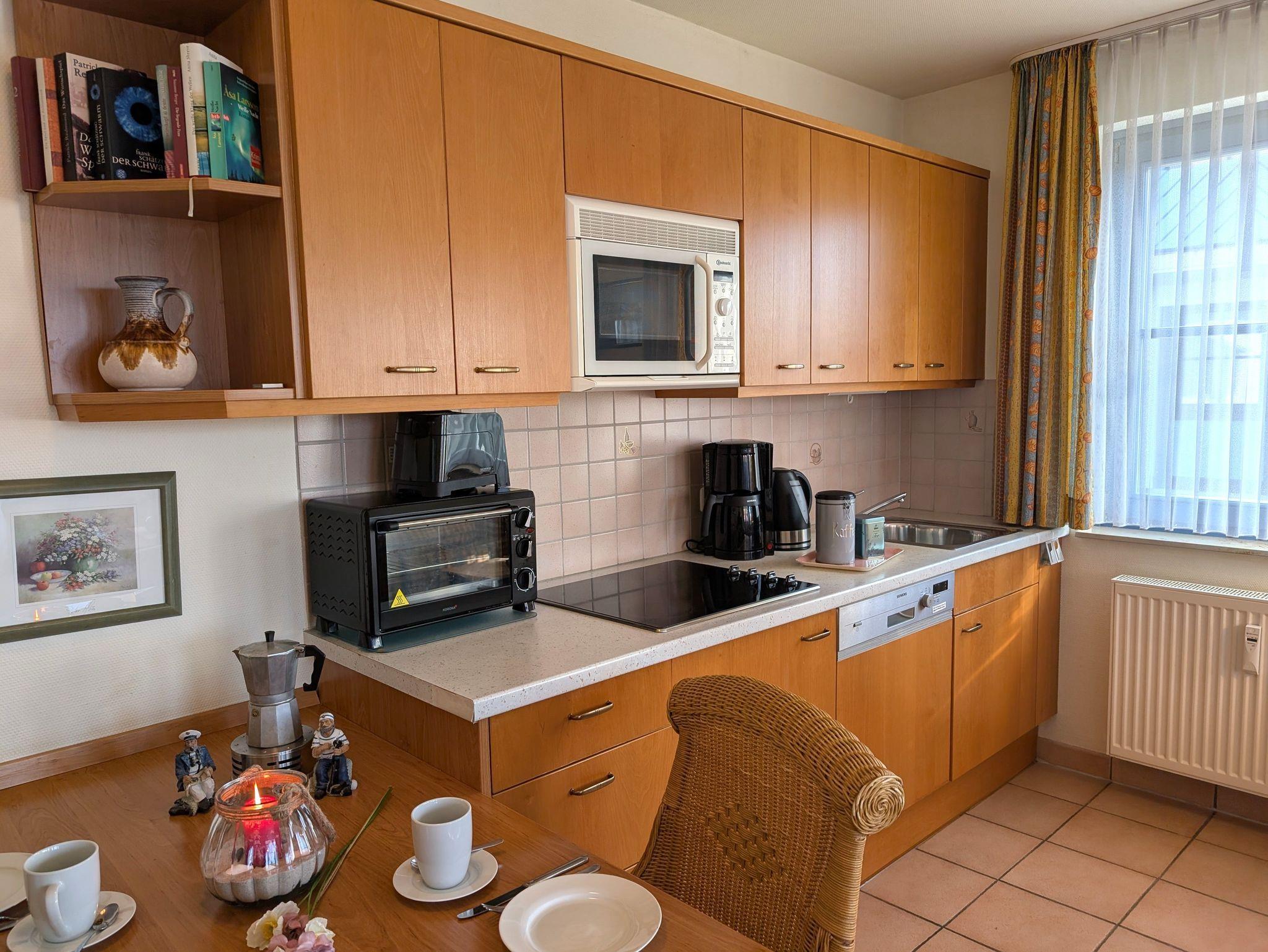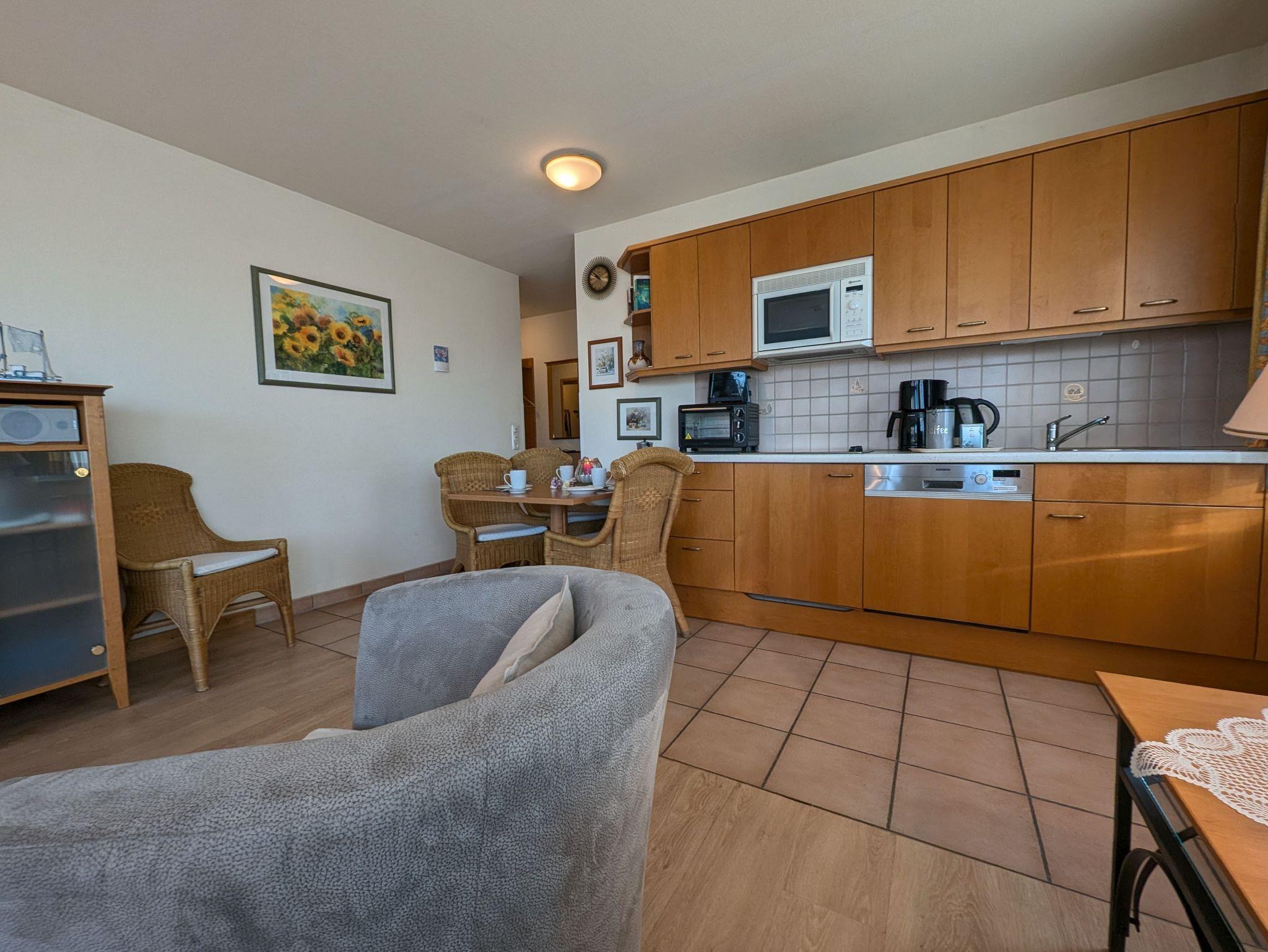 die helle und freundliche Wohnung liegt in direkter Strandlage. Die Terrasse liegt süd- westseitig und lädt zum gemütlichen Frühstück oder Abendessen ein, oder genießen Sie einfach die traumhaften Sonnenuntergänge am feinsandigen Ostseestrand in 50 m Entfernung. Das Wohnzimmer verfügt über eine Schlafcouch für 2 Personen, SAT- TV, Musikanlage und kostenlosem WLAN- Zugang. Das Schlafzimmer ist ausgestattet mit einem Radiowecker und einem Doppelbett 1,80 x 2,00 m (getrennte Matratzen) sowie viel Stauraum. Die offen gestaltete Küchenzeile mit umfangreichen Kochutensilien, 4-Platten- Cerankochfeld, Geschirrspülmaschine, Minibackofen und dem Essplatz laden zum gemeinsamen Kochen und Beisammensein ein. Teilweise ist ein Insektenschutz vorhanden. Das Bad mit Badewanne inkl. Duschabtrennung und WC ist innen-liegend. Der Parkplatz befindet sich in der Tiefgarage. Ein Münz-Waschsalon finden Sie im Nachbarhaus. Die Wohnung wird inklusive Bettwäsche übergeben, Handtücher können in der Zimmervermittlung für 7,00 € pro Person (1 Badetuch, 1 Handtuch) dazugebucht werden. Haustiere sind nicht gestattet.Die Wohnung ist eine Nichtraucherwohnung.